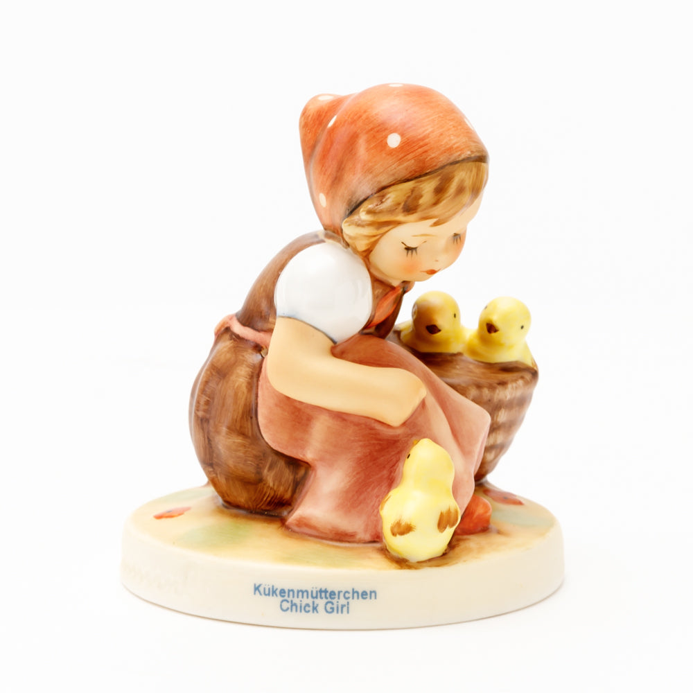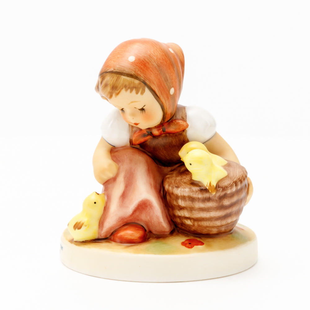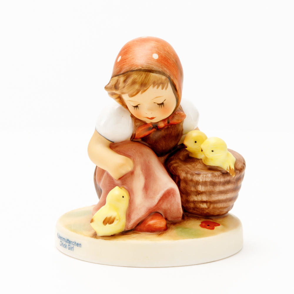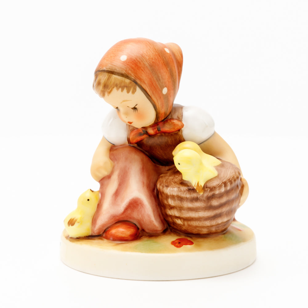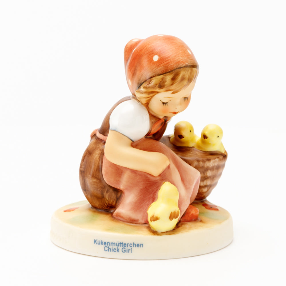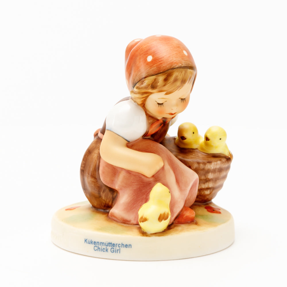 Das erste „Kükenmütterchen“-Modell stammt von Reinhold Unger aus dem Jahr 1936, wurde aber von Gerhard Skrobek 1964 umgestaltet. In dieser Version ist es seither erhältlich und hat sich im Laufe der Zeit zu einem echten Hummel-Klassiker gemausert. Besonders lieblich sind natürlich die kleinen gelben Küken dargestellt. Aber auch die leicht geröteten Wangen, der Korb und das rote Kopftuch verzaubern Hummel-Freunde und -Liebhaber auf der ganzen Welt. Kleine Größen der Figur enthalten zwei Küken im Korb, während bei Größe 57/I drei Küken im Korb sitzen. Diese Größe 57 2/0 kam erstmals 1985 auf den Markt.