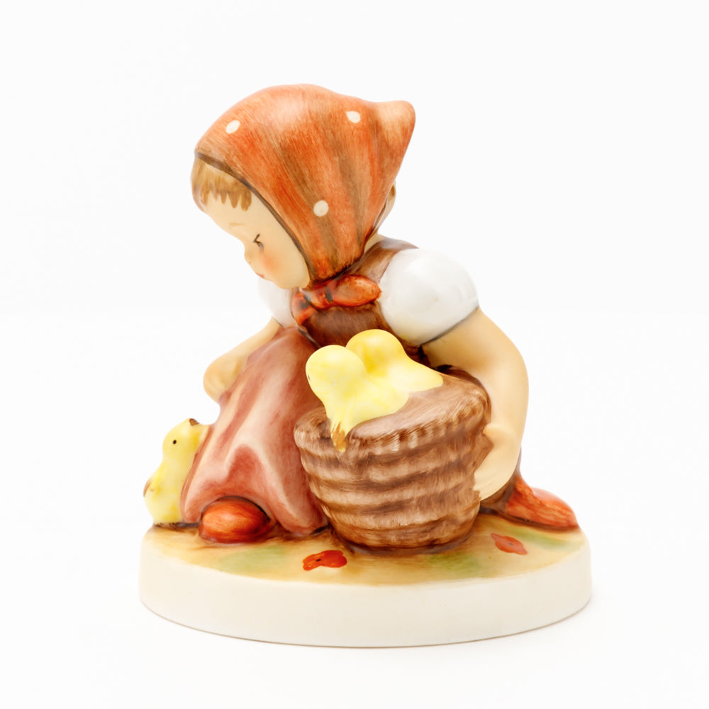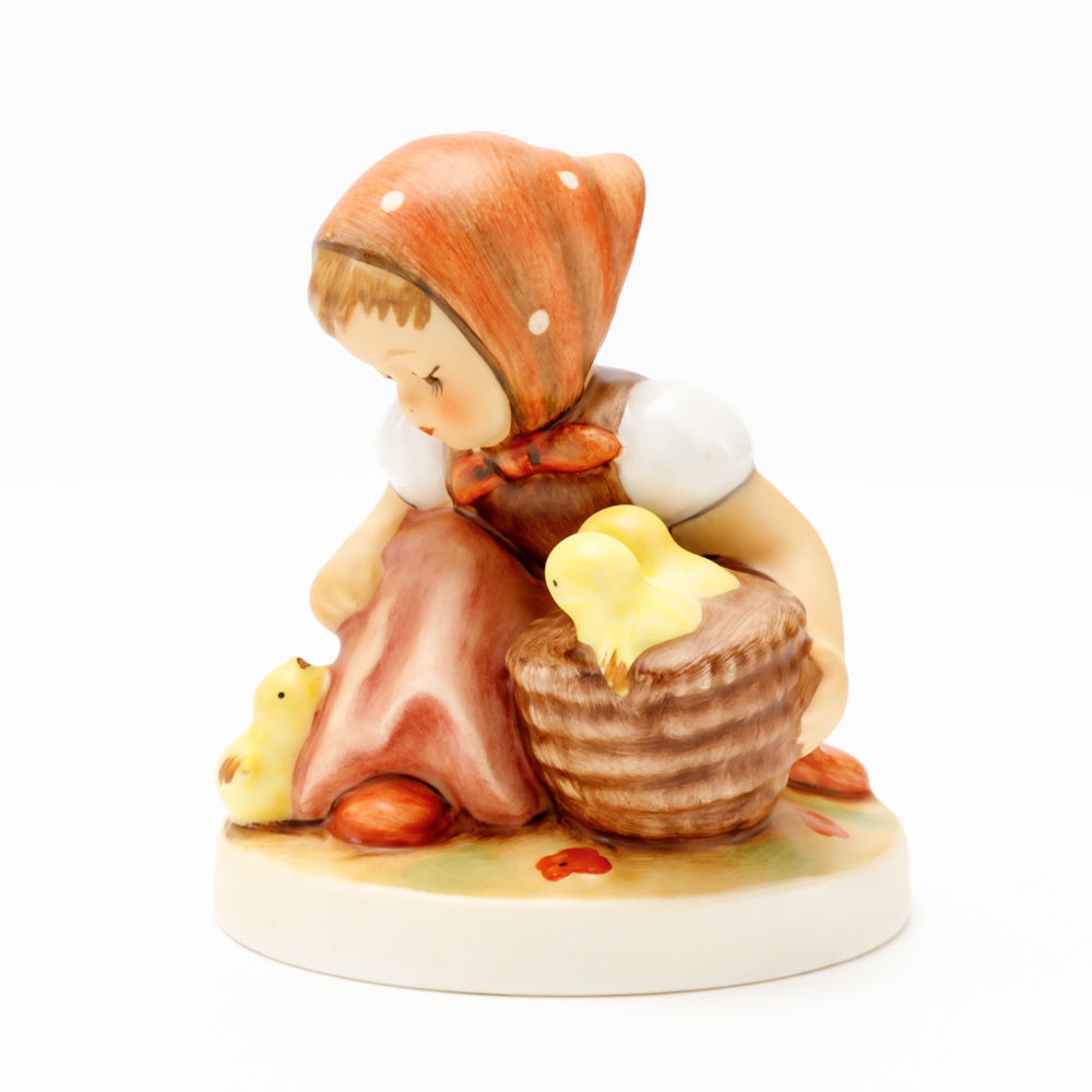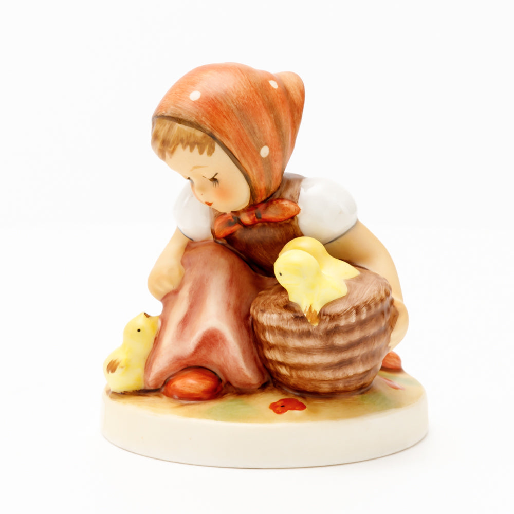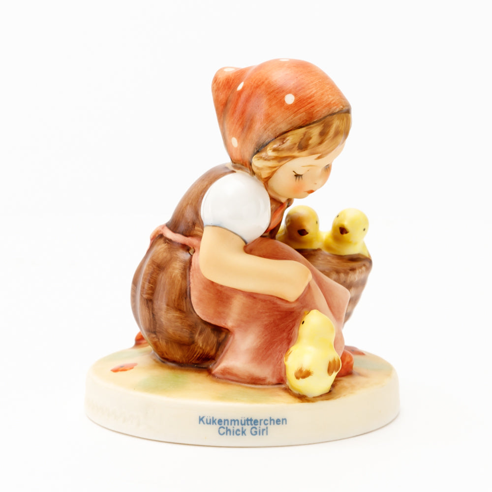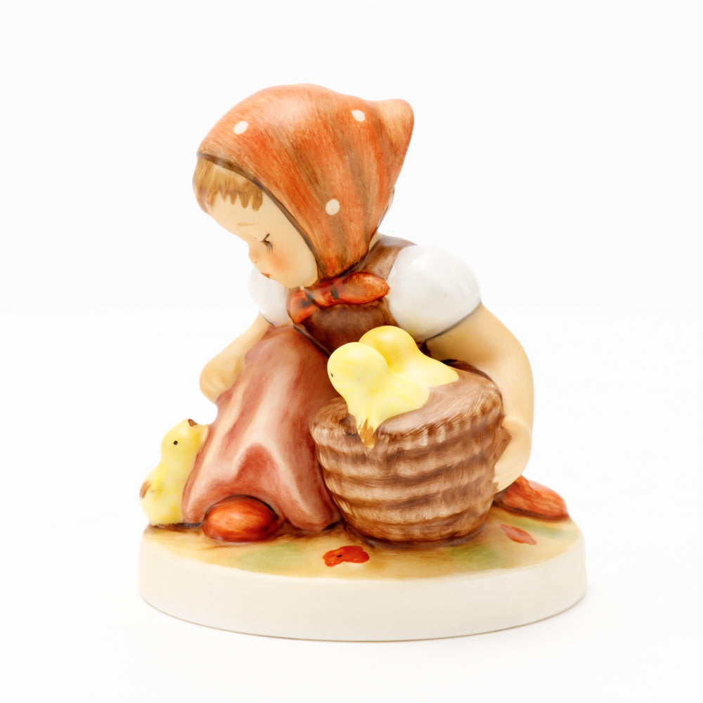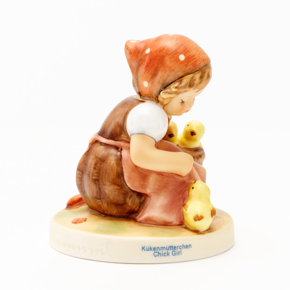 Das erste „Kükenmütterchen“-Modell stammt von Reinhold Unger aus dem Jahr 1936, wurde aber von Gerhard Skrobek 1964 umgestaltet. In dieser Version ist es seither erhältlich und hat sich im Laufe der Zeit zu einem echten Hummel-Klassiker gemausert. Besonders lieblich sind natürlich die kleinen gelben Küken dargestellt. Aber auch die leicht geröteten Wangen, der Korb und das rote Kopftuch verzaubern Hummel-Freunde und -Liebhaber auf der ganzen Welt. Kleine Größen der Figur enthalten zwei Küken im Korb, während bei Größe 57/I drei Küken im Korb sitzen. Diese Größe 57 2/0 kam erstmals 1985 auf den Markt.