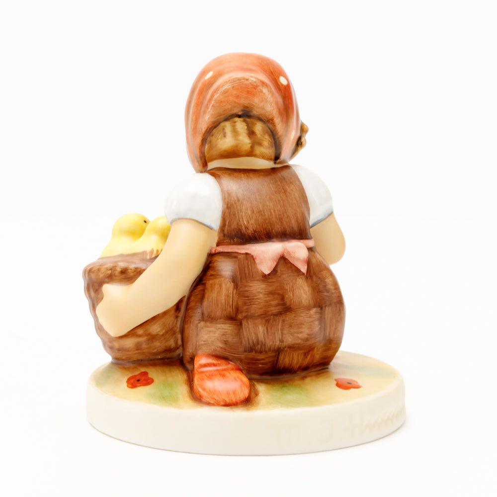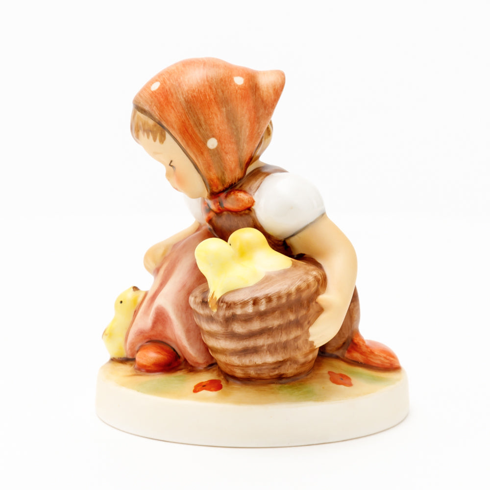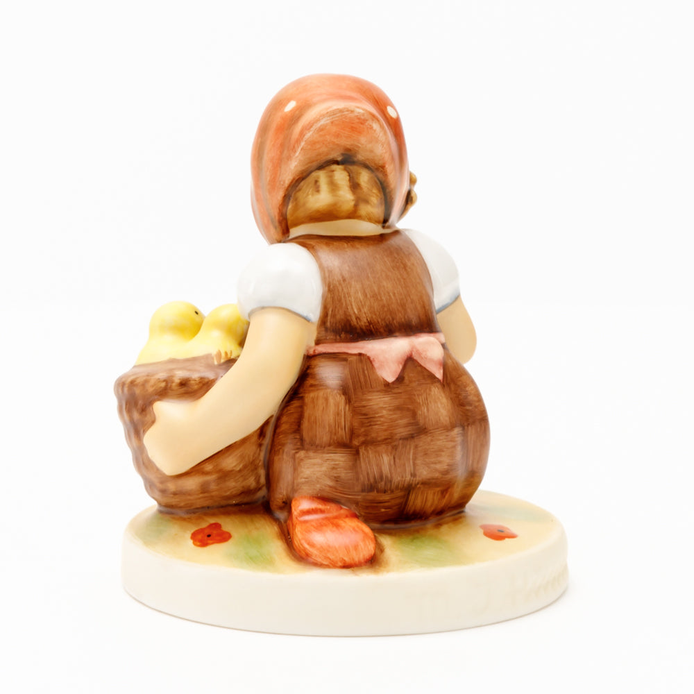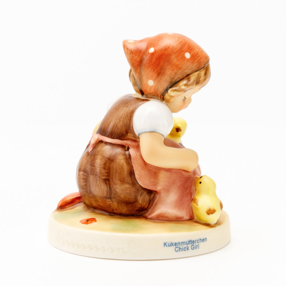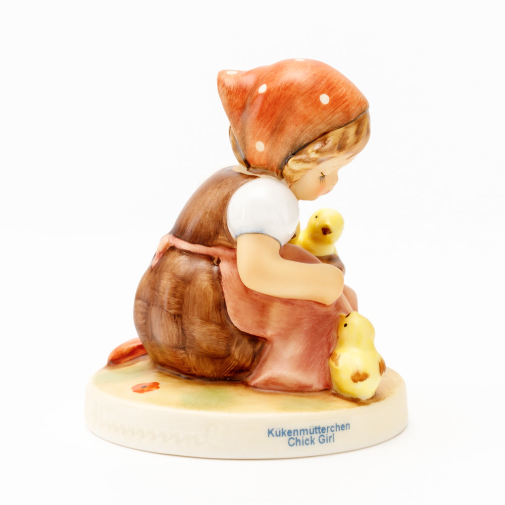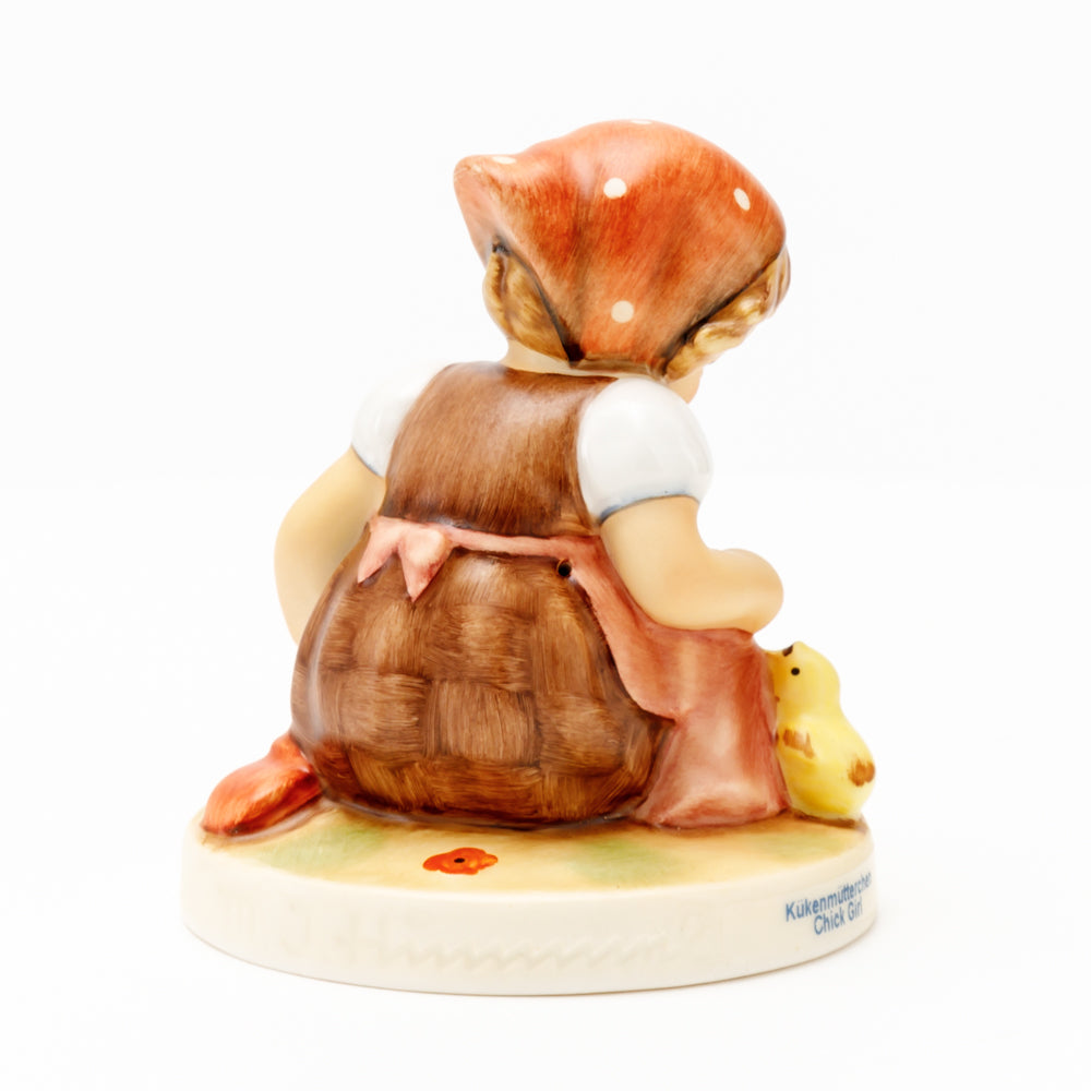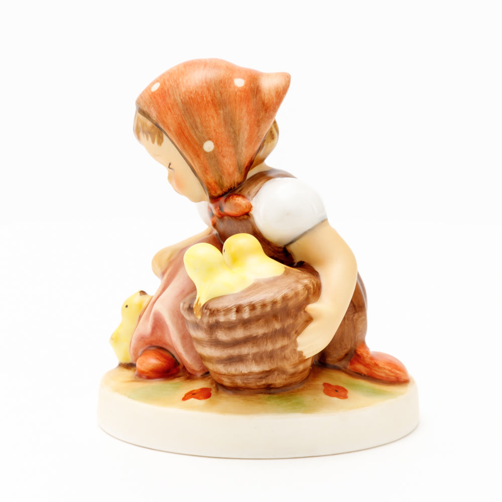 Das erste „Kükenmütterchen“-Modell stammt von Reinhold Unger aus dem Jahr 1936, wurde aber von Gerhard Skrobek 1964 umgestaltet. In dieser Version ist es seither erhältlich und hat sich im Laufe der Zeit zu einem echten Hummel-Klassiker gemausert. Besonders lieblich sind natürlich die kleinen gelben Küken dargestellt. Aber auch die leicht geröteten Wangen, der Korb und das rote Kopftuch verzaubern Hummel-Freunde und -Liebhaber auf der ganzen Welt. Kleine Größen der Figur enthalten zwei Küken im Korb, während bei Größe 57/I drei Küken im Korb sitzen. Diese Größe 57 2/0 kam erstmals 1985 auf den Markt.