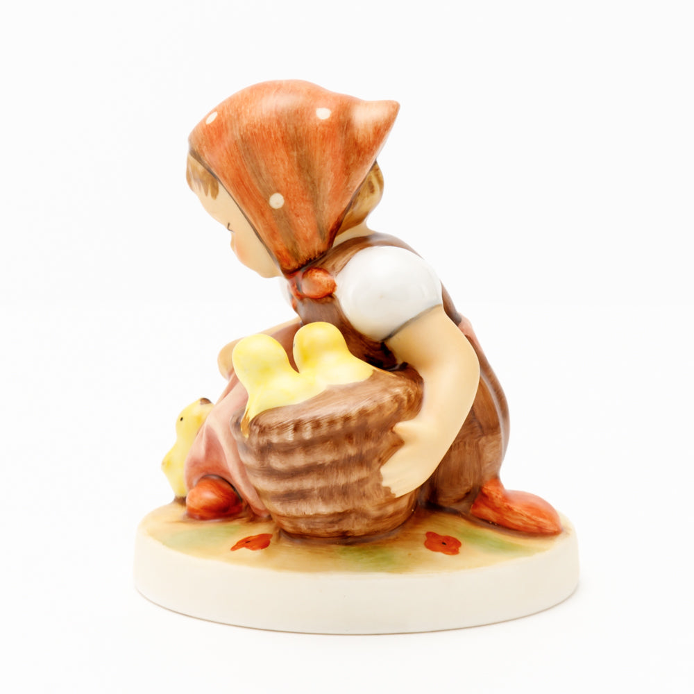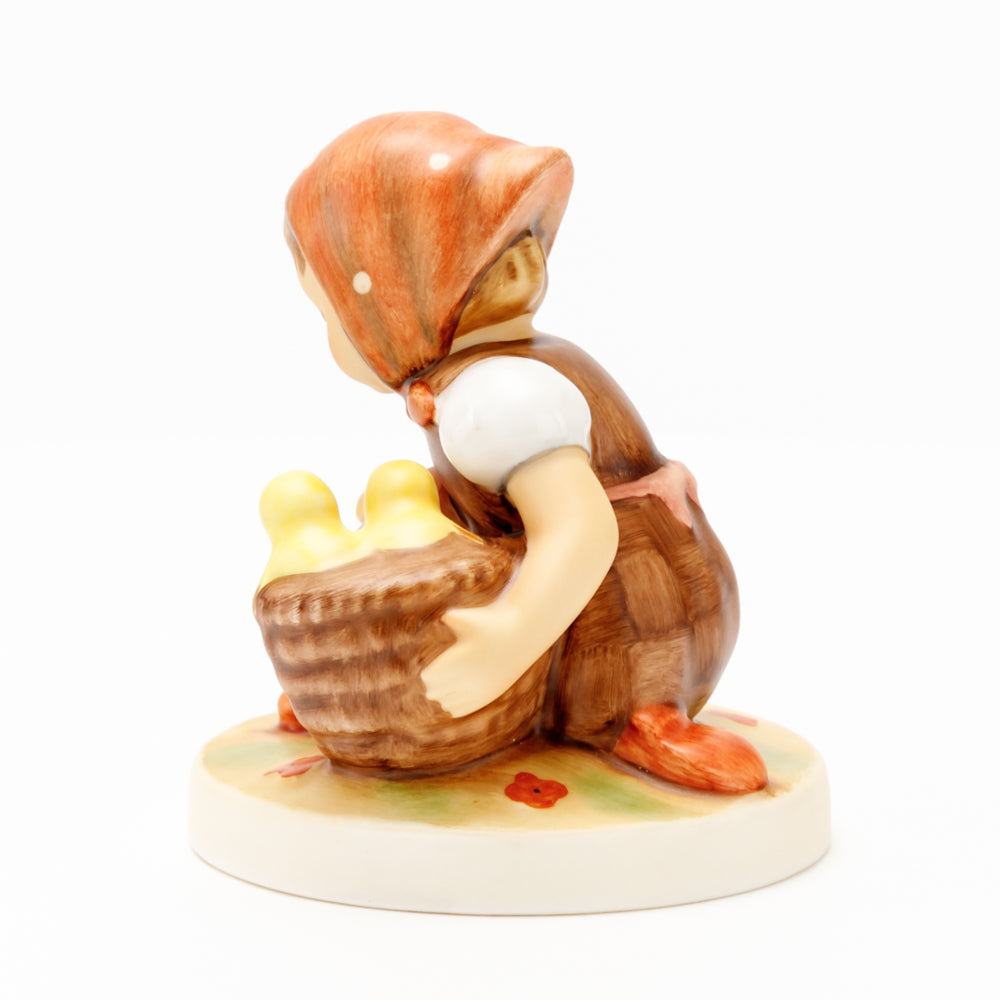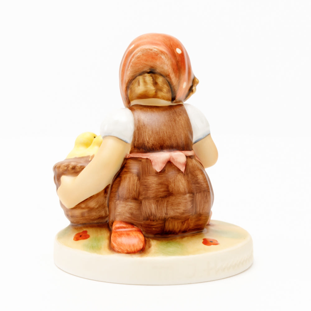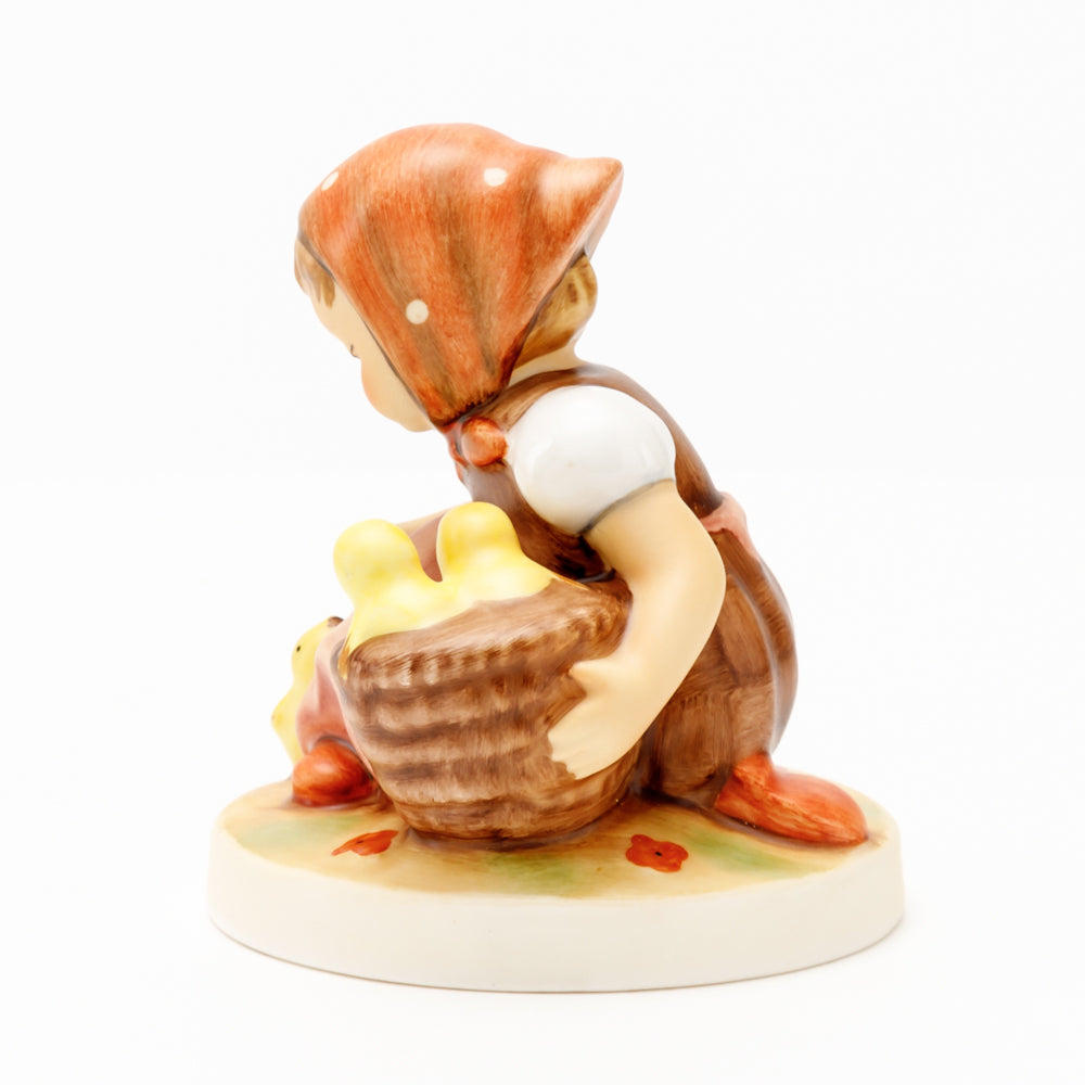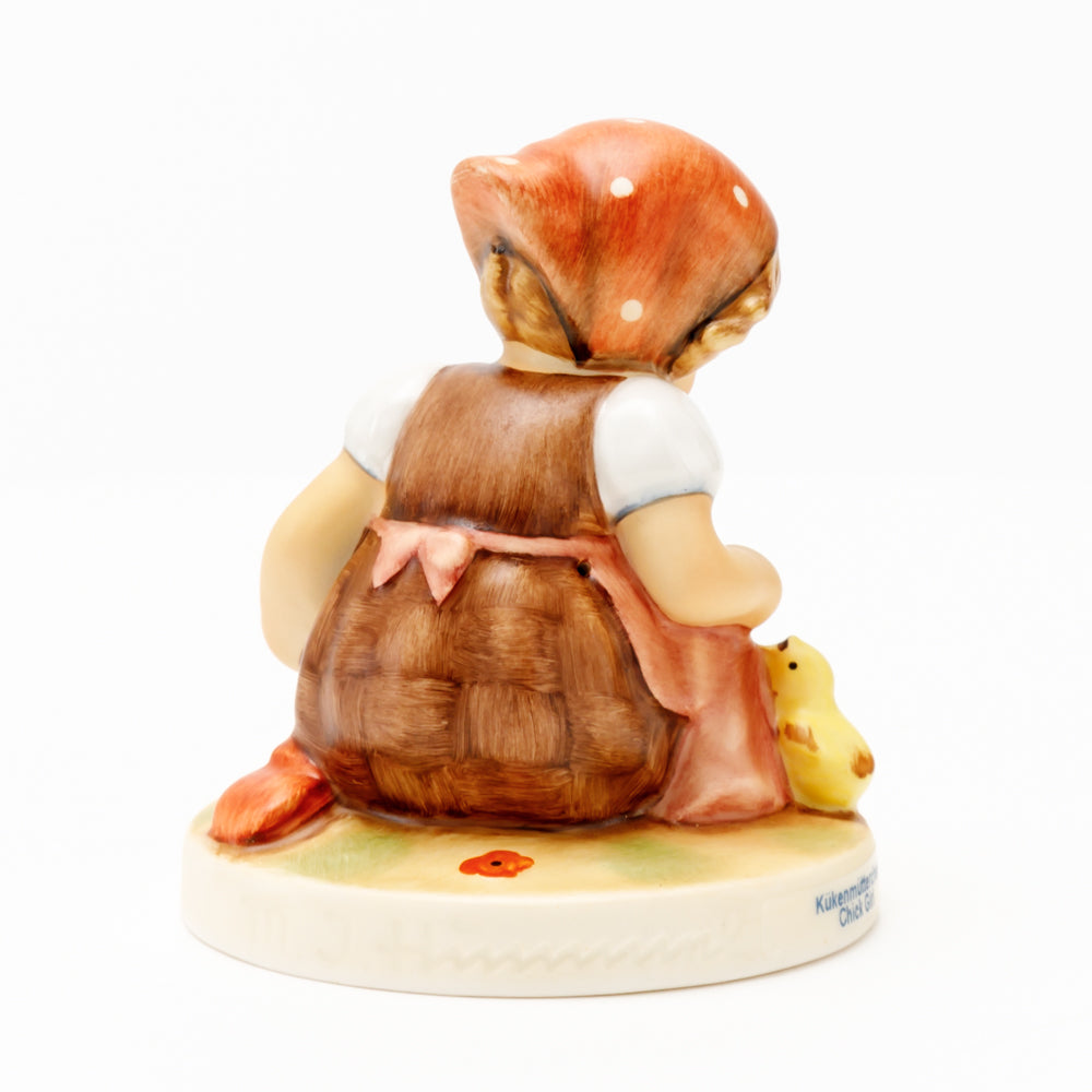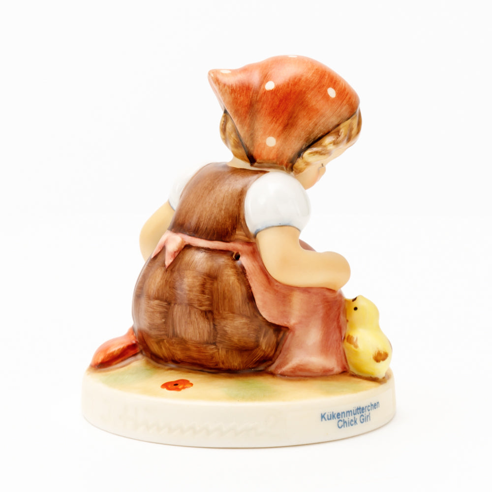 Das erste „Kükenmütterchen“-Modell stammt von Reinhold Unger aus dem Jahr 1936, wurde aber von Gerhard Skrobek 1964 umgestaltet. In dieser Version ist es seither erhältlich und hat sich im Laufe der Zeit zu einem echten Hummel-Klassiker gemausert. Besonders lieblich sind natürlich die kleinen gelben Küken dargestellt. Aber auch die leicht geröteten Wangen, der Korb und das rote Kopftuch verzaubern Hummel-Freunde und -Liebhaber auf der ganzen Welt. Kleine Größen der Figur enthalten zwei Küken im Korb, während bei Größe 57/I drei Küken im Korb sitzen. Diese Größe 57 2/0 kam erstmals 1985 auf den Markt.