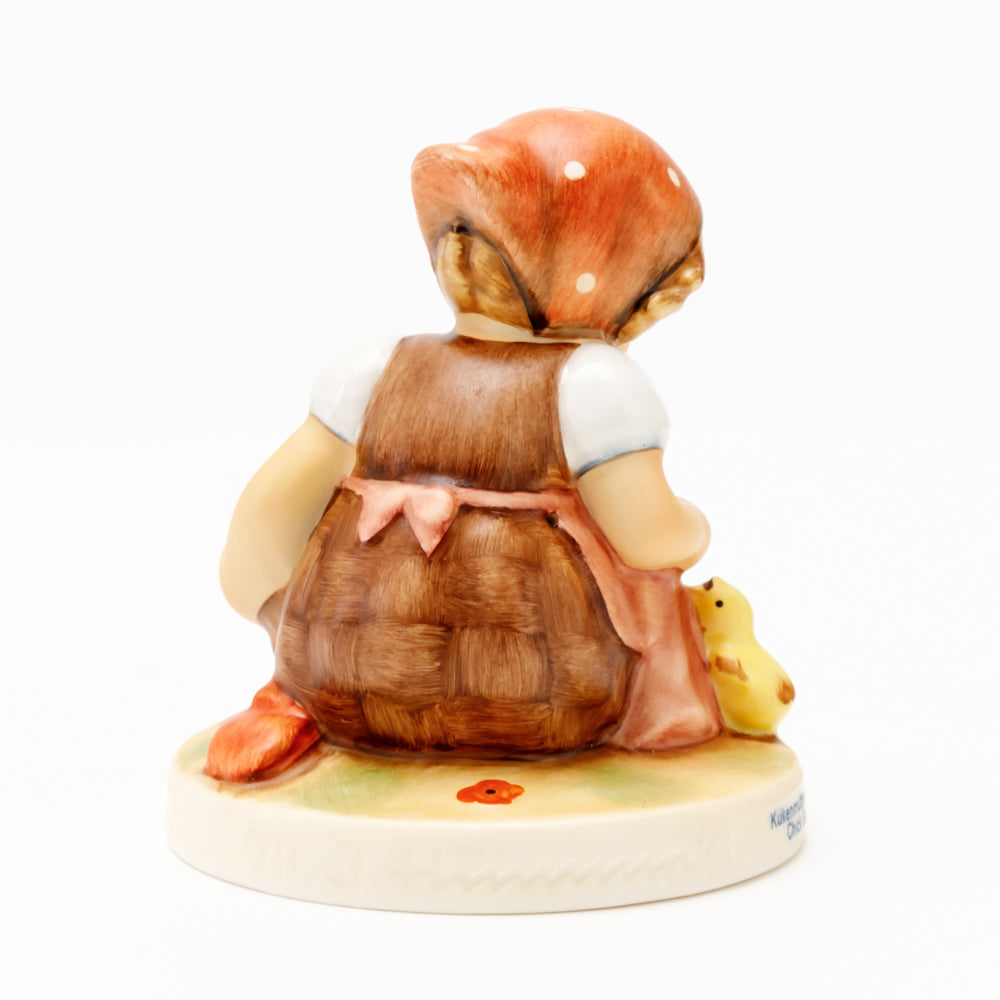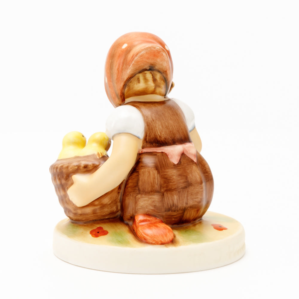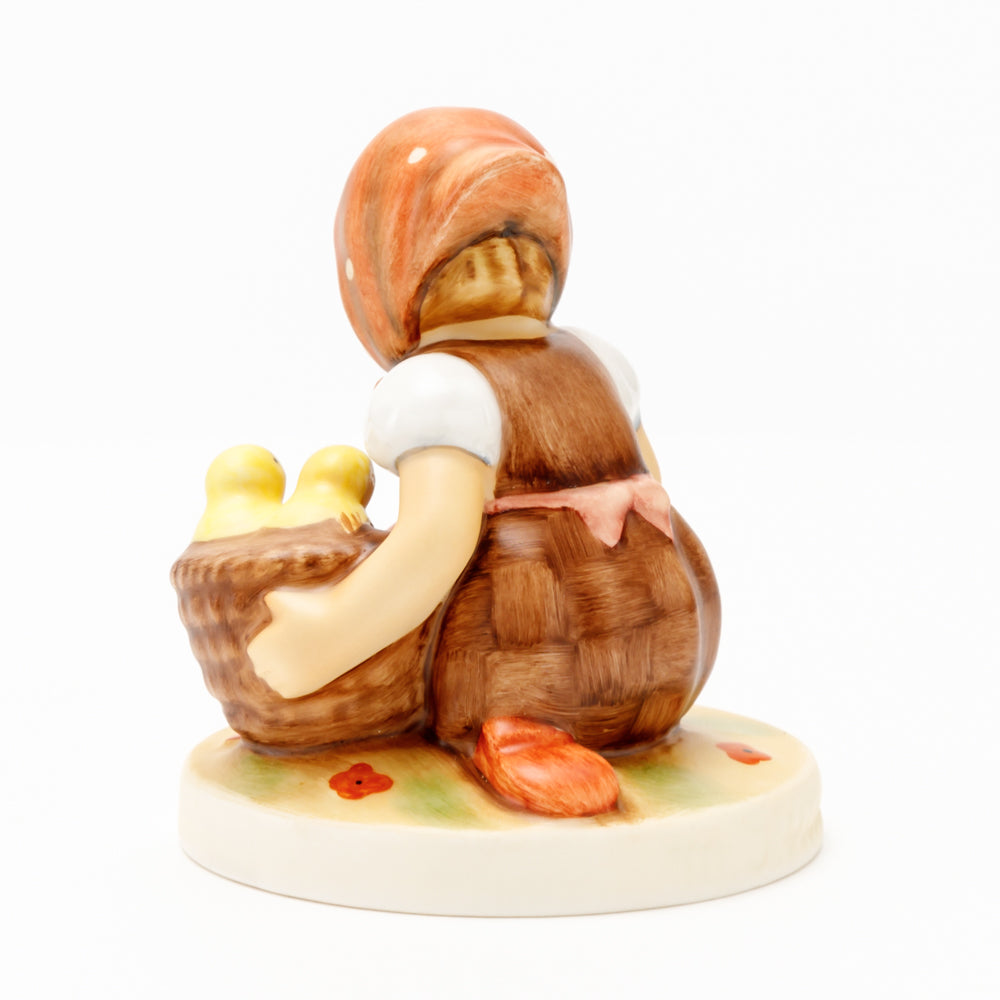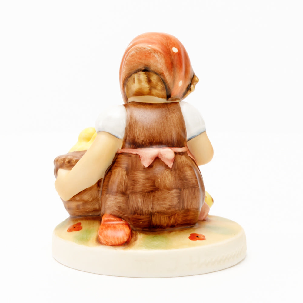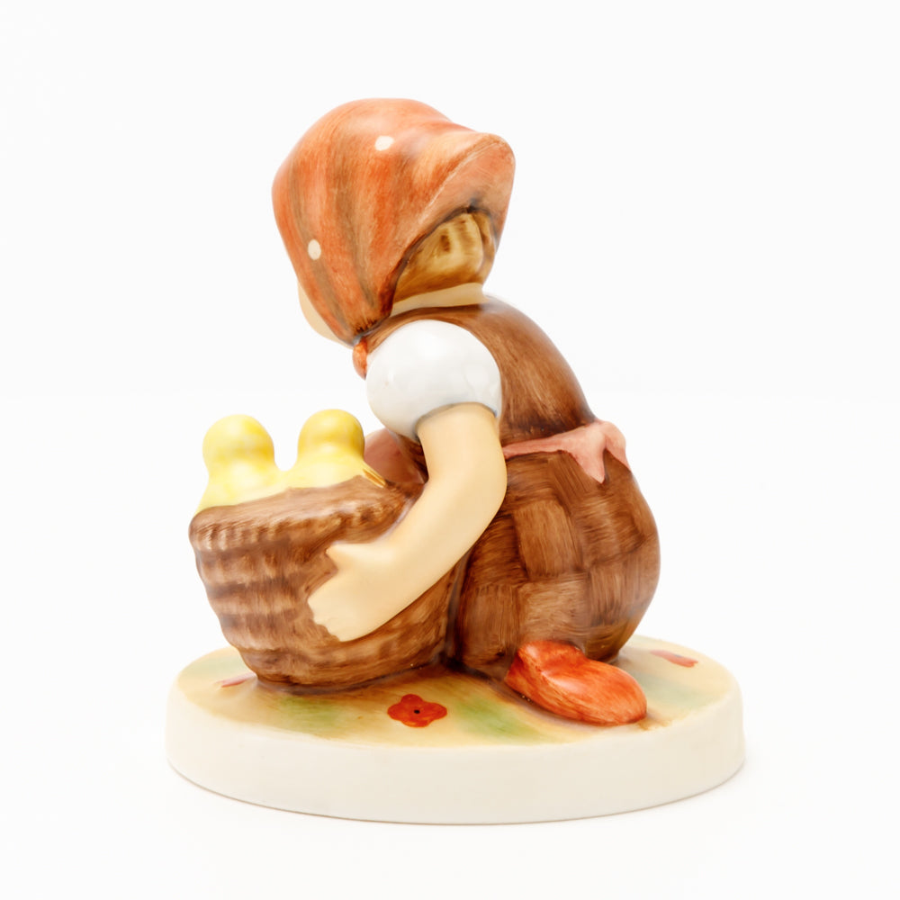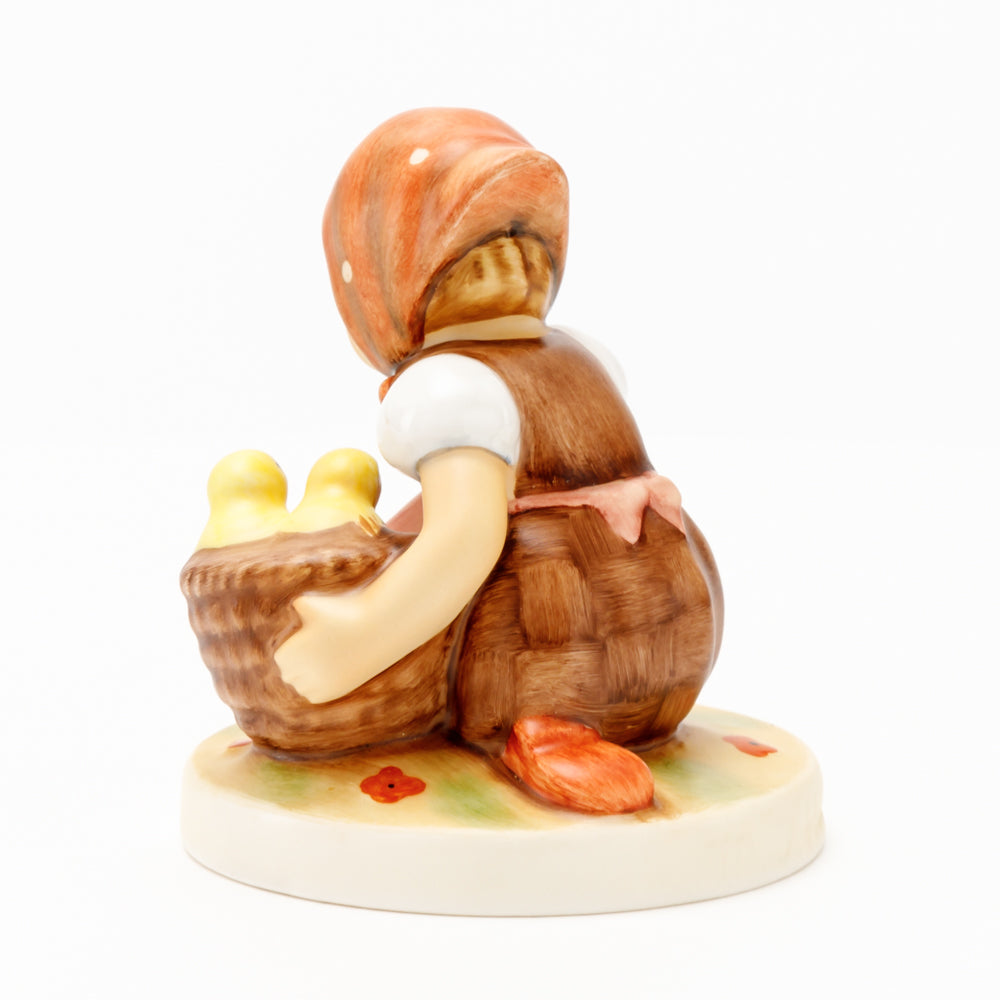 Das erste „Kükenmütterchen“-Modell stammt von Reinhold Unger aus dem Jahr 1936, wurde aber von Gerhard Skrobek 1964 umgestaltet. In dieser Version ist es seither erhältlich und hat sich im Laufe der Zeit zu einem echten Hummel-Klassiker gemausert. Besonders lieblich sind natürlich die kleinen gelben Küken dargestellt. Aber auch die leicht geröteten Wangen, der Korb und das rote Kopftuch verzaubern Hummel-Freunde und -Liebhaber auf der ganzen Welt. Kleine Größen der Figur enthalten zwei Küken im Korb, während bei Größe 57/I drei Küken im Korb sitzen. Diese Größe 57 2/0 kam erstmals 1985 auf den Markt.