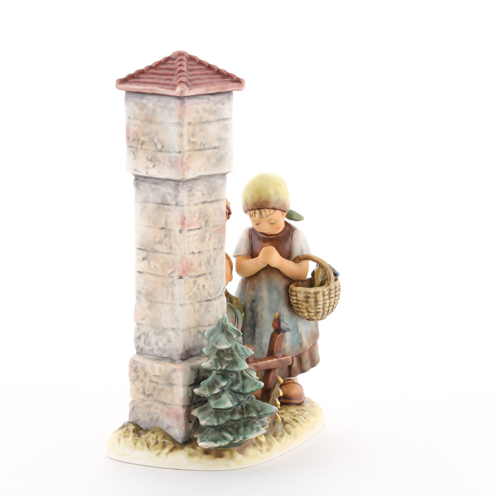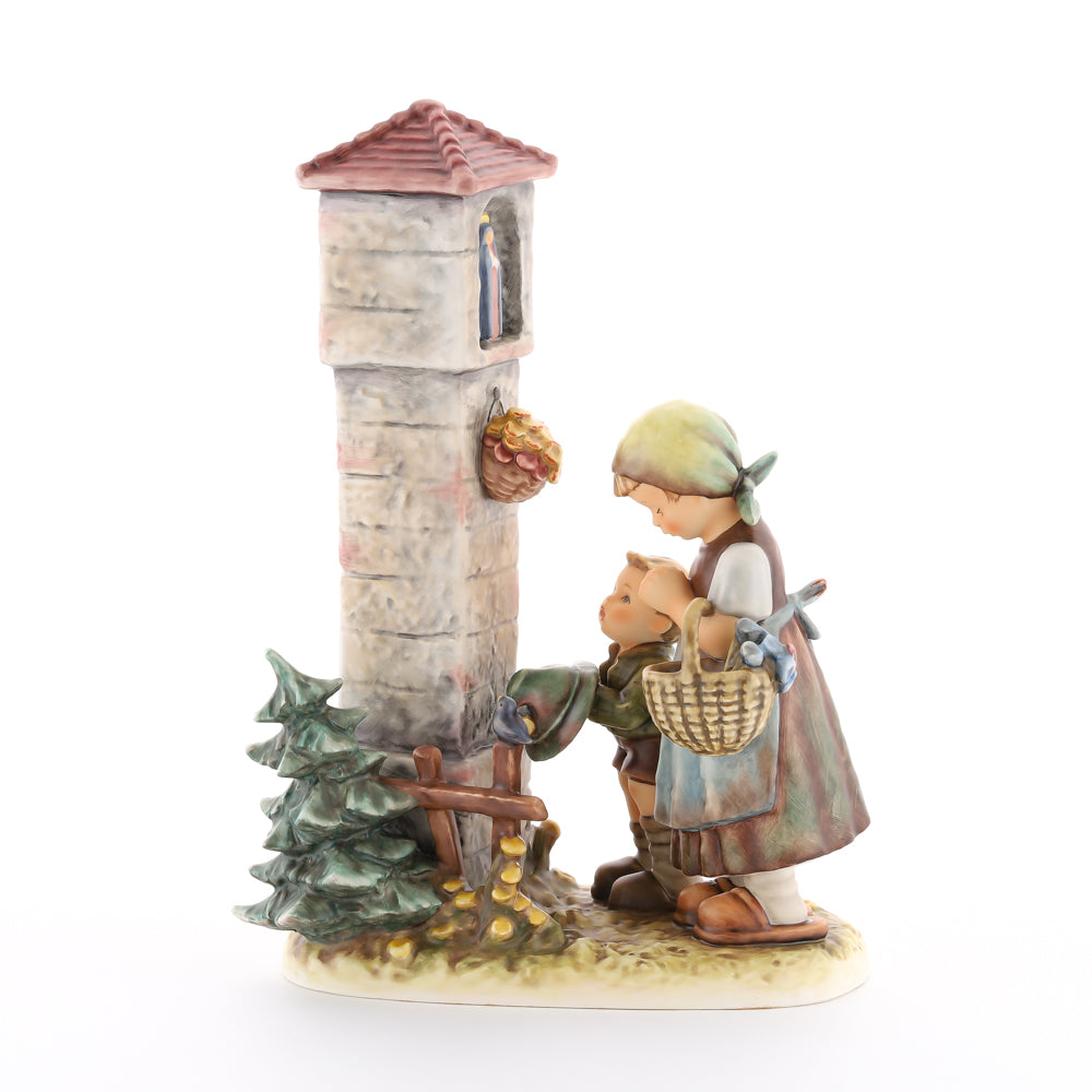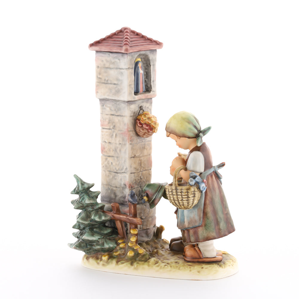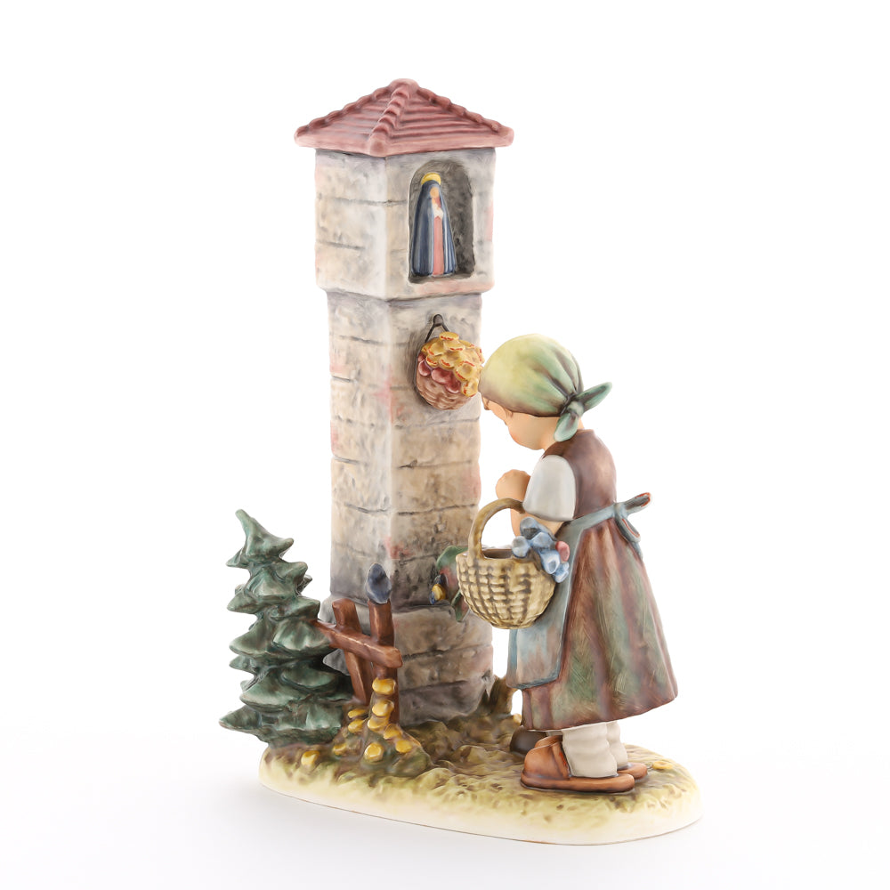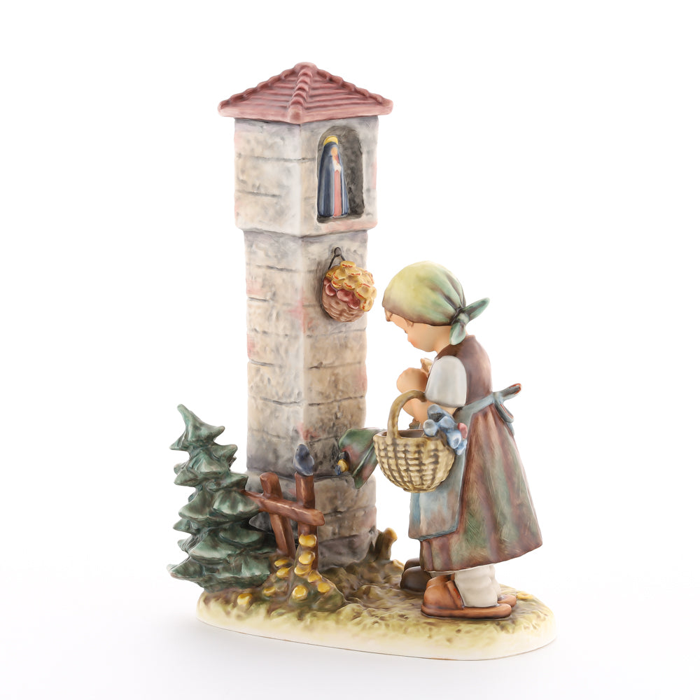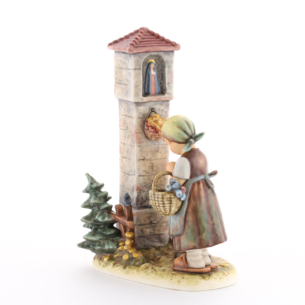 Andächtig halten die beiden Kinder am „Marterl“ inne, dem liebevoll mit Blumen geschmückten Bildstock am Wegesrand. Der kleine Bub hat respektvoll seinen Hut abgenommen und blickt zur Madonnenfigur, die oben in der Säule eingelassen ist. Seine größere Schwester ist ins Gebet versunken. Am Arm trägt sie einen Korb voller Blumen, die vielleicht zu Hause den Tisch schmücken sollen. Ein kleiner Vogel hat sich auf dem Zaun niedergelassen und leistet den Kindern bei ihrer Andacht Gesellschaft. Die neue Figur der Skrobek-Serie hält einen Moment voller inniger Zwiesprache mit Maria auf wunderbare Weise fest und lädt den Betrachter ein, sich immer wieder neu in die fein ausgearbeiteten Details zu vertiefen.