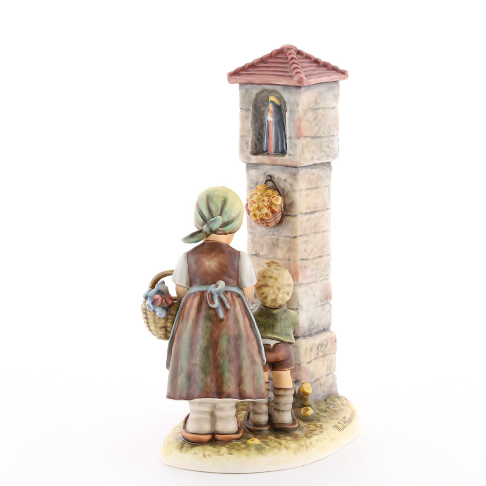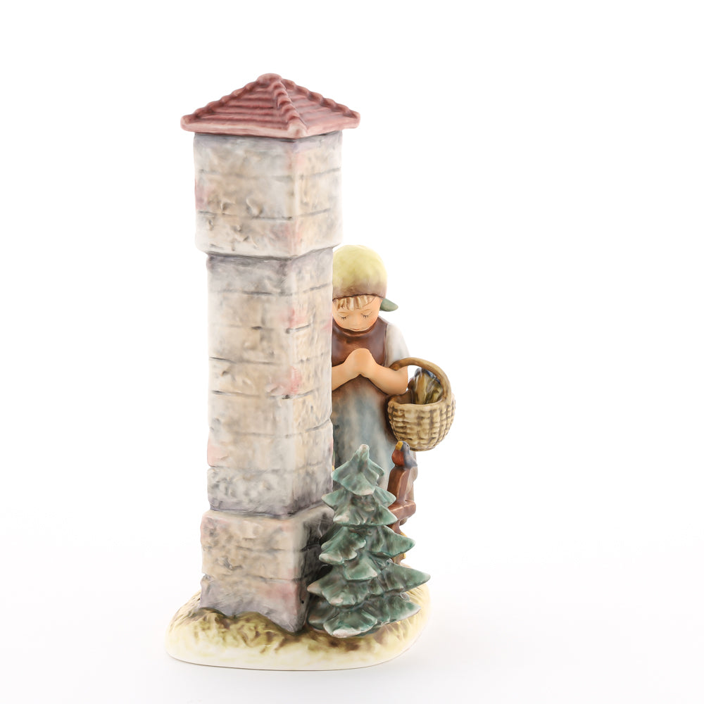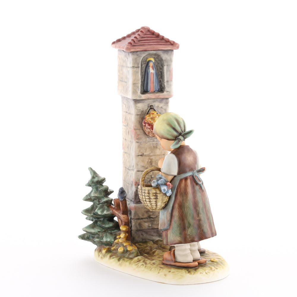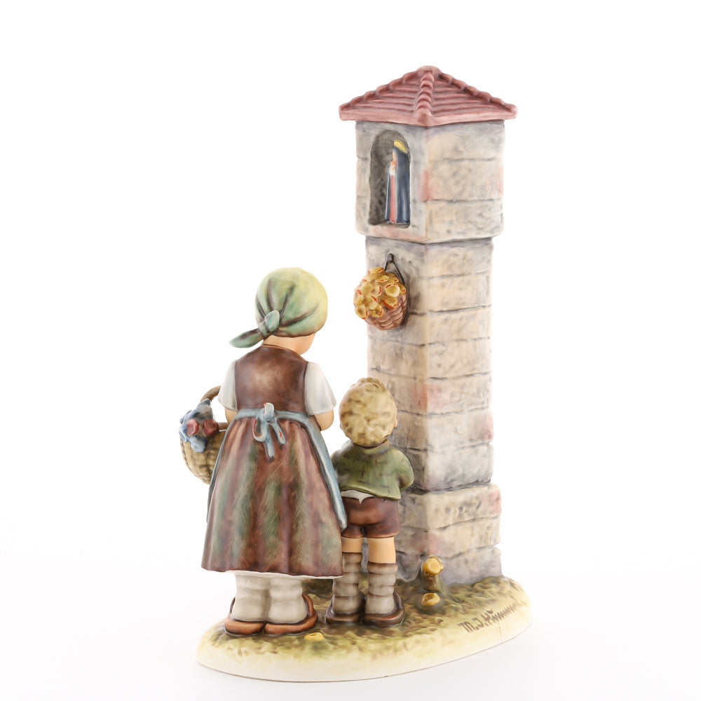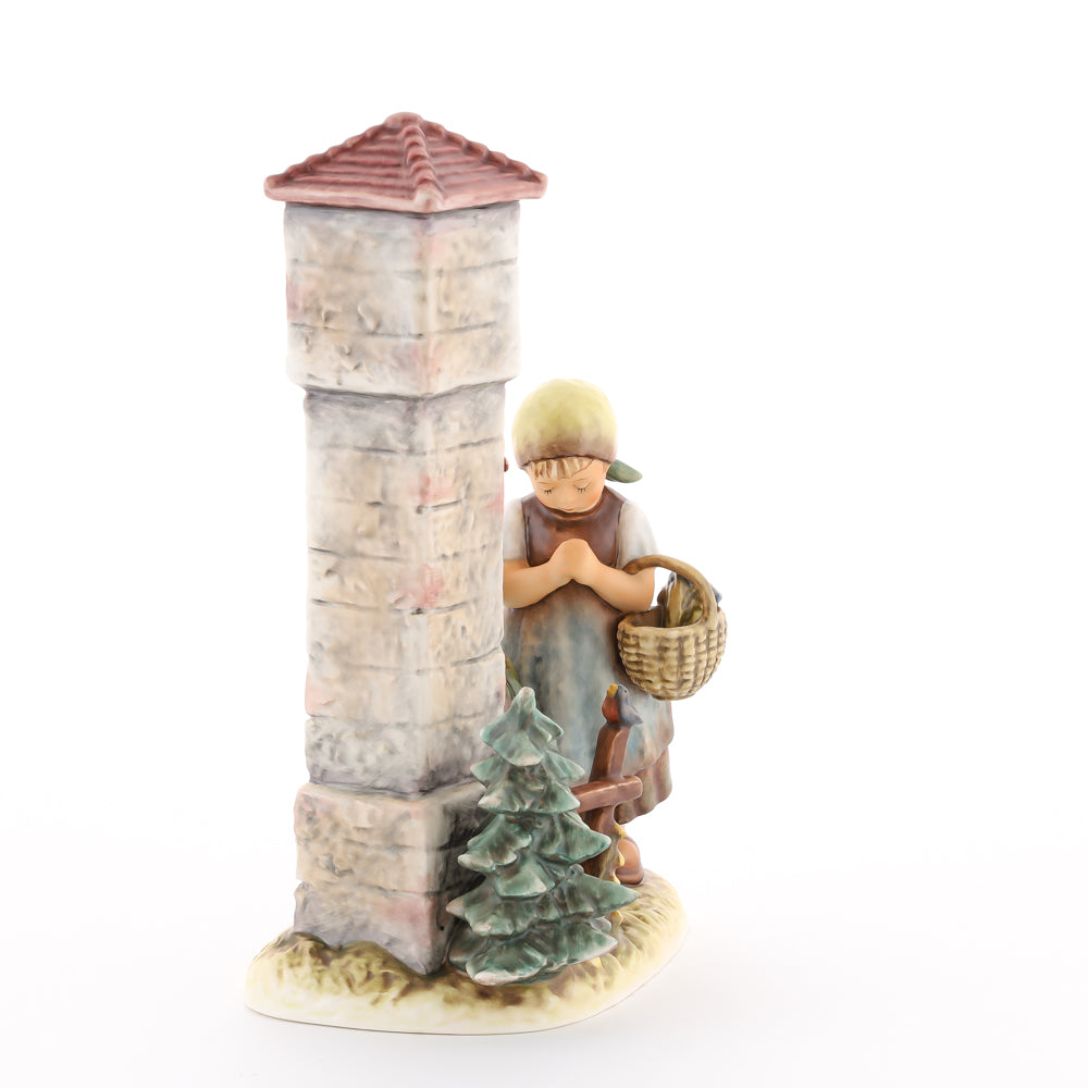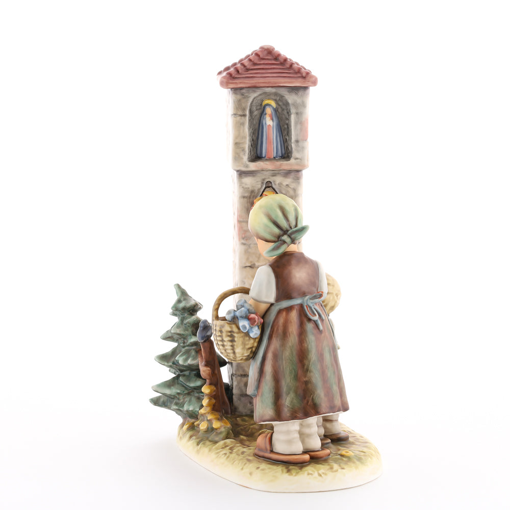 Andächtig halten die beiden Kinder am „Marterl“ inne, dem liebevoll mit Blumen geschmückten Bildstock am Wegesrand. Der kleine Bub hat respektvoll seinen Hut abgenommen und blickt zur Madonnenfigur, die oben in der Säule eingelassen ist. Seine größere Schwester ist ins Gebet versunken. Am Arm trägt sie einen Korb voller Blumen, die vielleicht zu Hause den Tisch schmücken sollen. Ein kleiner Vogel hat sich auf dem Zaun niedergelassen und leistet den Kindern bei ihrer Andacht Gesellschaft. Die neue Figur der Skrobek-Serie hält einen Moment voller inniger Zwiesprache mit Maria auf wunderbare Weise fest und lädt den Betrachter ein, sich immer wieder neu in die fein ausgearbeiteten Details zu vertiefen.