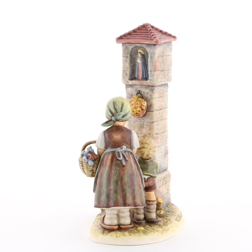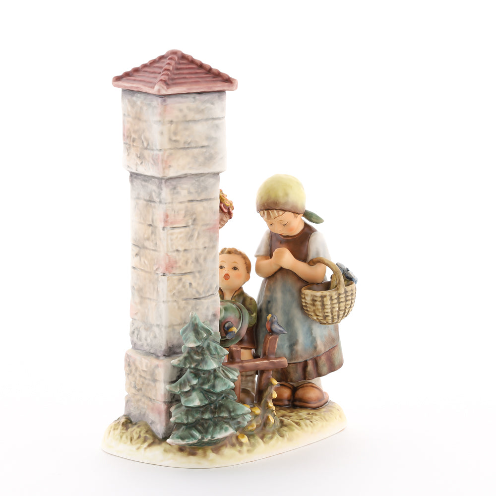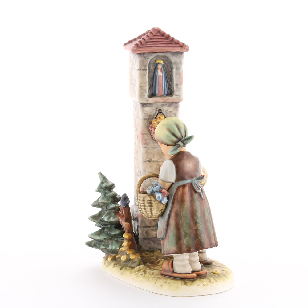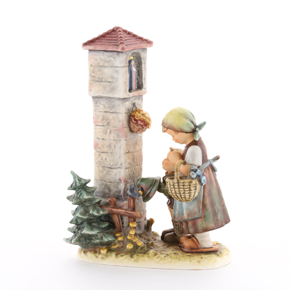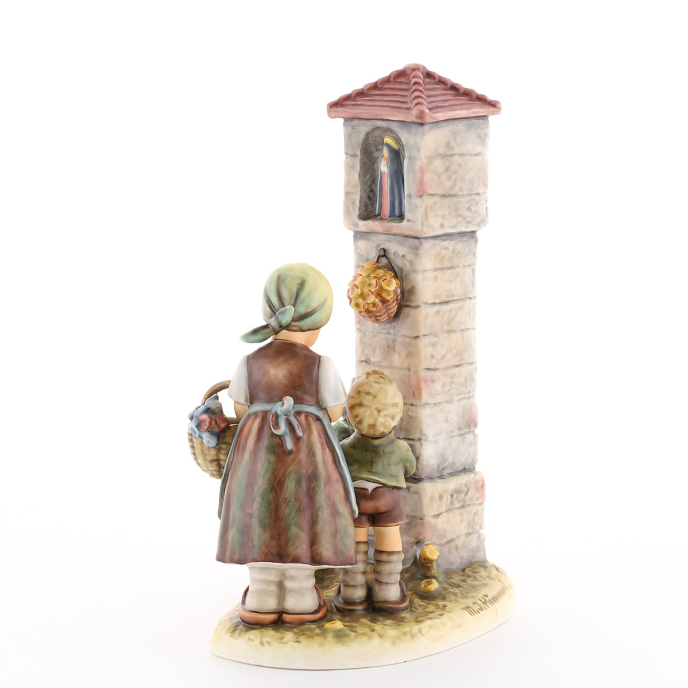 Andächtig halten die beiden Kinder am „Marterl“ inne, dem liebevoll mit Blumen geschmückten Bildstock am Wegesrand. Der kleine Bub hat respektvoll seinen Hut abgenommen und blickt zur Madonnenfigur, die oben in der Säule eingelassen ist. Seine größere Schwester ist ins Gebet versunken. Am Arm trägt sie einen Korb voller Blumen, die vielleicht zu Hause den Tisch schmücken sollen. Ein kleiner Vogel hat sich auf dem Zaun niedergelassen und leistet den Kindern bei ihrer Andacht Gesellschaft. Die neue Figur der Skrobek-Serie hält einen Moment voller inniger Zwiesprache mit Maria auf wunderbare Weise fest und lädt den Betrachter ein, sich immer wieder neu in die fein ausgearbeiteten Details zu vertiefen.