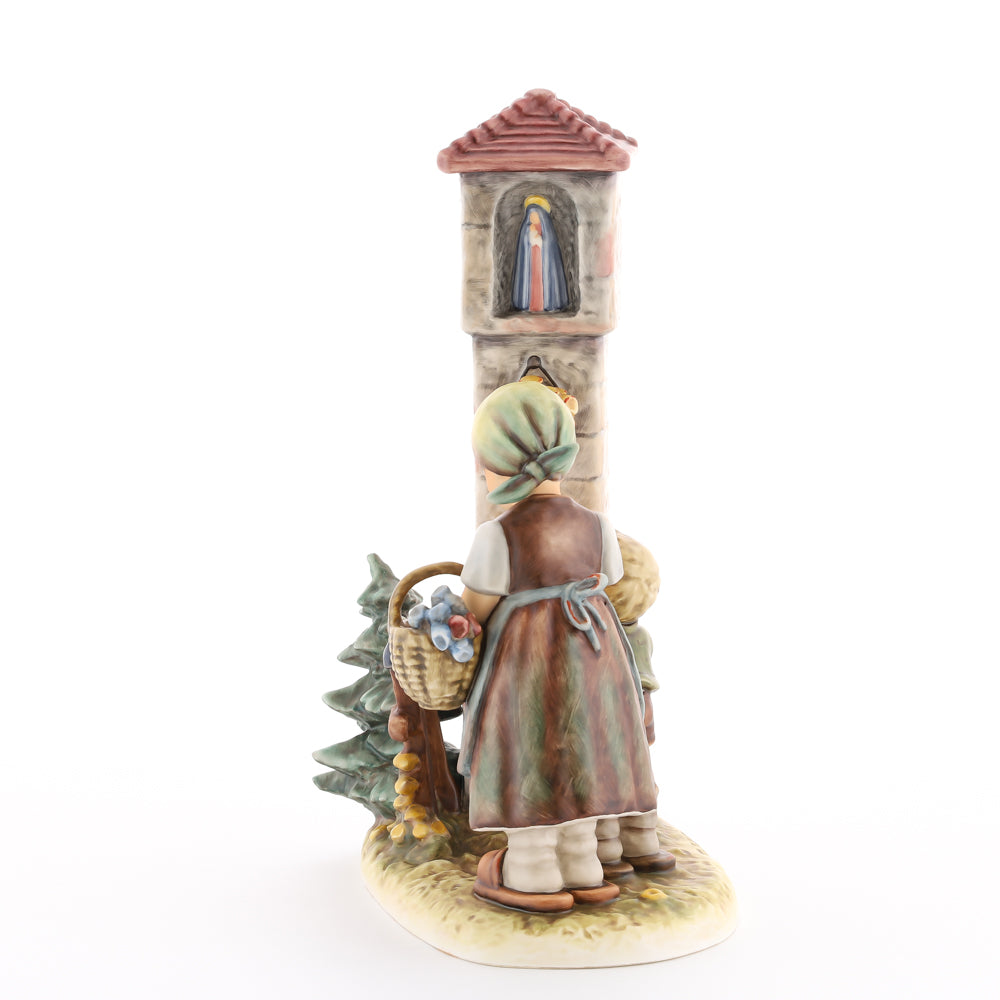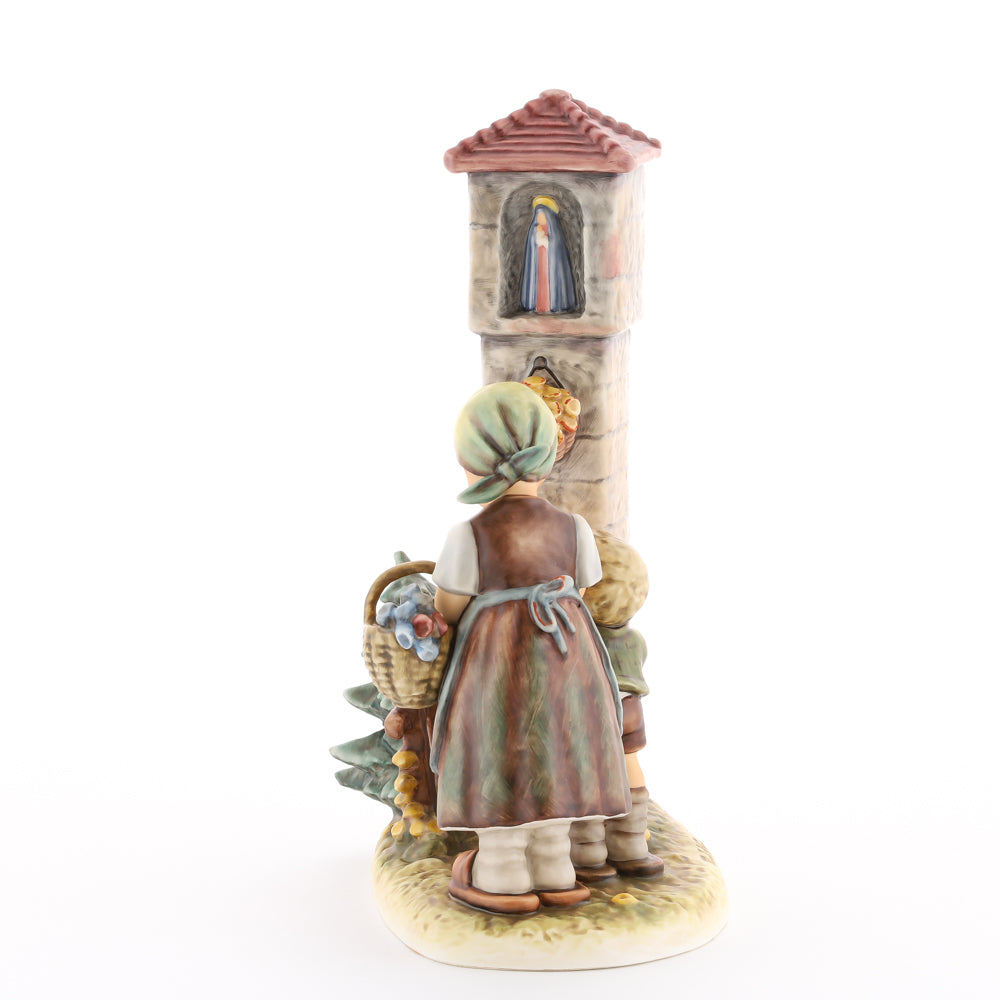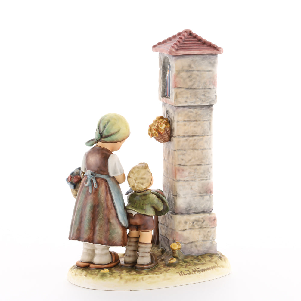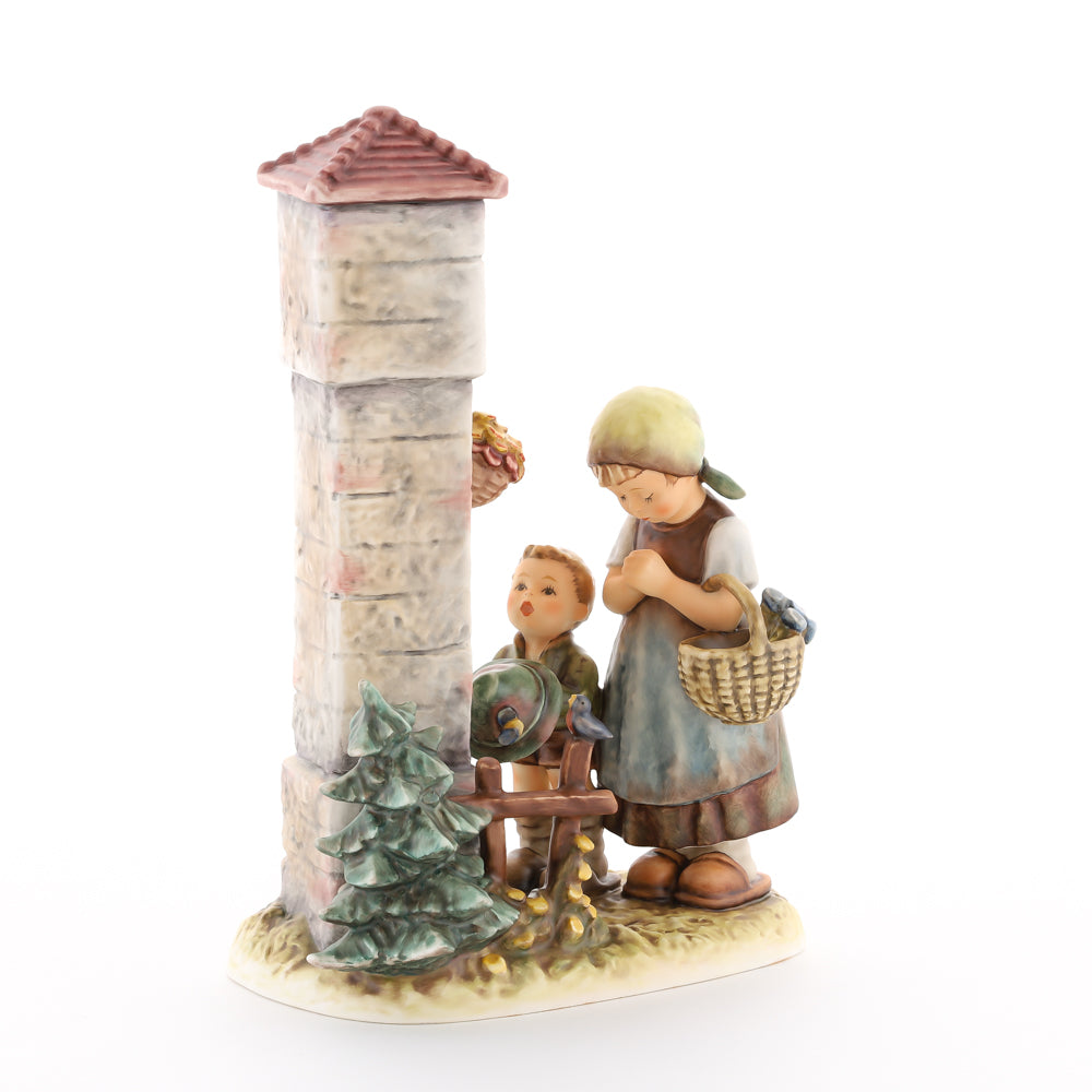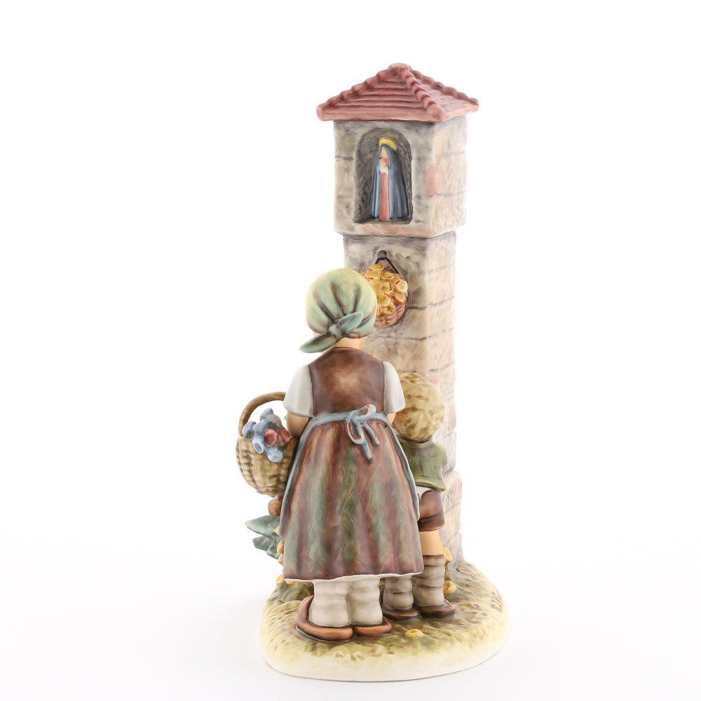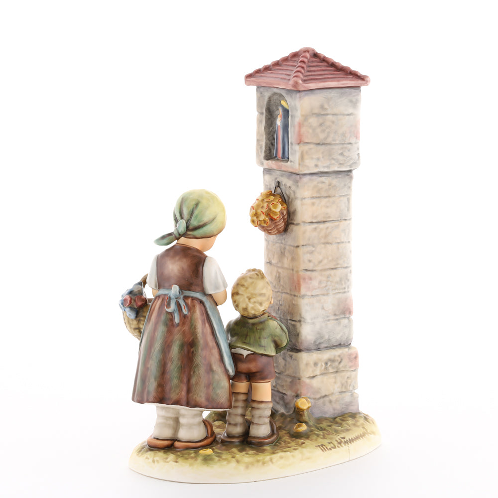 Andächtig halten die beiden Kinder am „Marterl“ inne, dem liebevoll mit Blumen geschmückten Bildstock am Wegesrand. Der kleine Bub hat respektvoll seinen Hut abgenommen und blickt zur Madonnenfigur, die oben in der Säule eingelassen ist. Seine größere Schwester ist ins Gebet versunken. Am Arm trägt sie einen Korb voller Blumen, die vielleicht zu Hause den Tisch schmücken sollen. Ein kleiner Vogel hat sich auf dem Zaun niedergelassen und leistet den Kindern bei ihrer Andacht Gesellschaft. Die neue Figur der Skrobek-Serie hält einen Moment voller inniger Zwiesprache mit Maria auf wunderbare Weise fest und lädt den Betrachter ein, sich immer wieder neu in die fein ausgearbeiteten Details zu vertiefen.