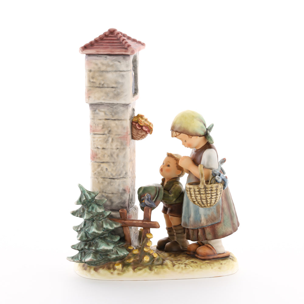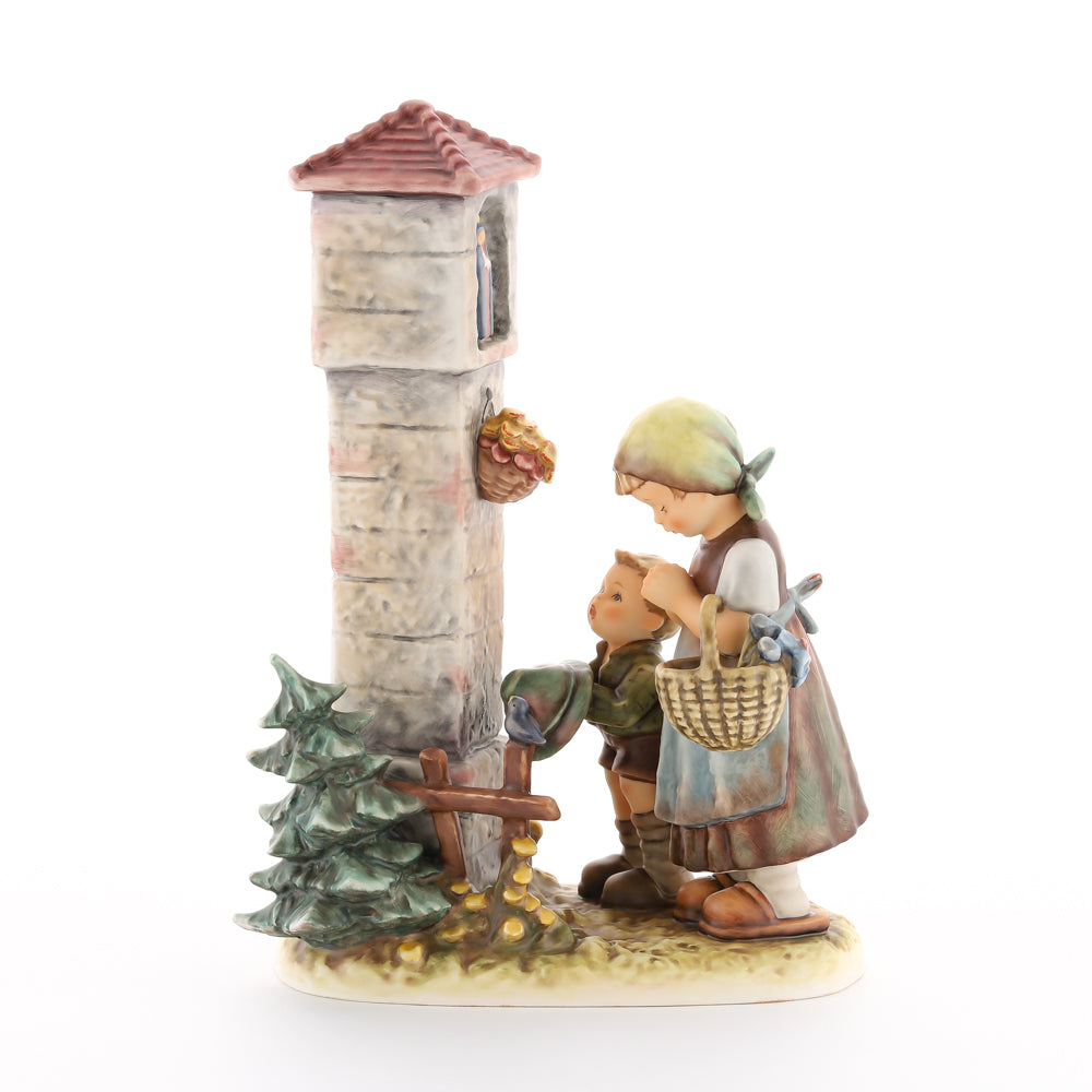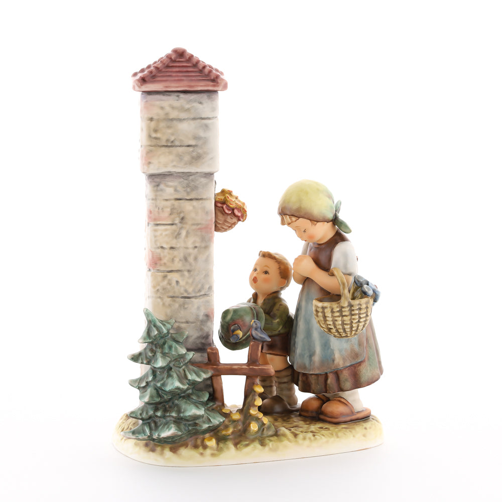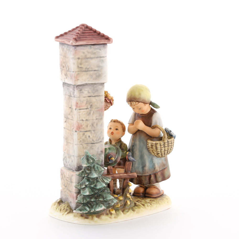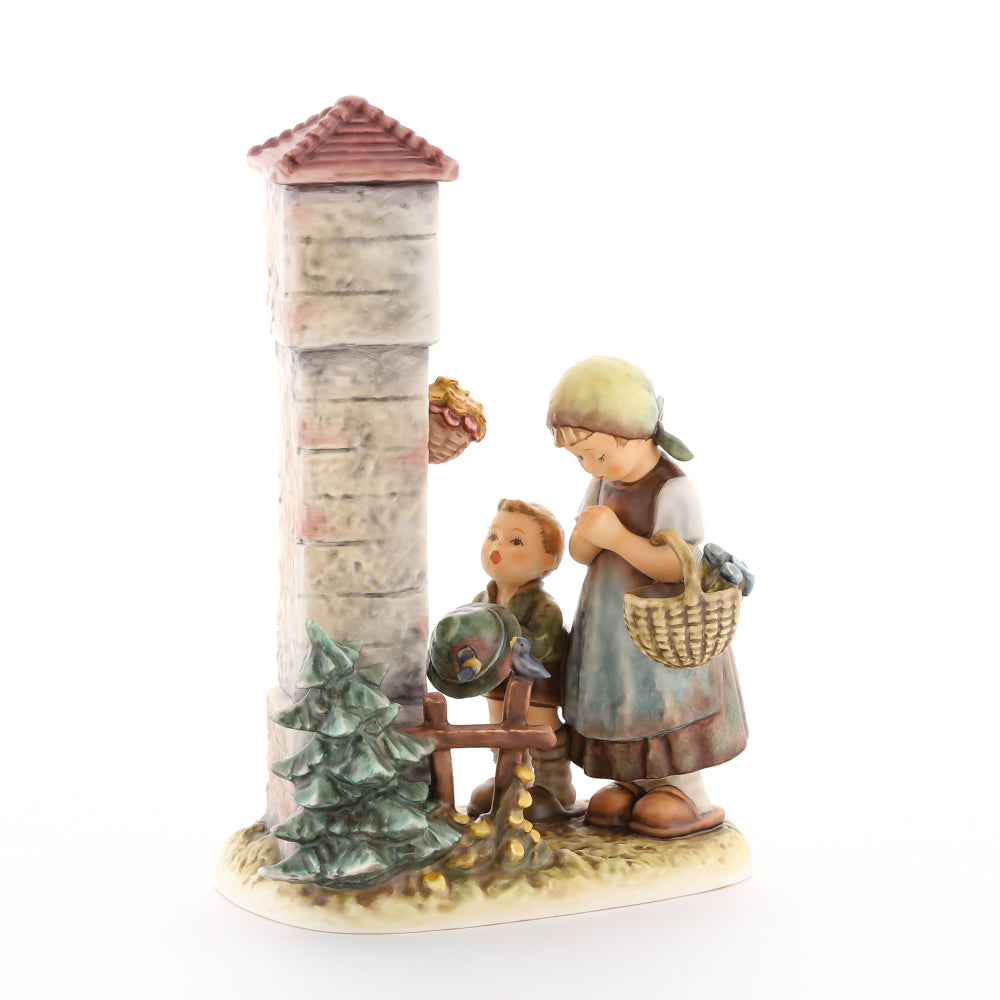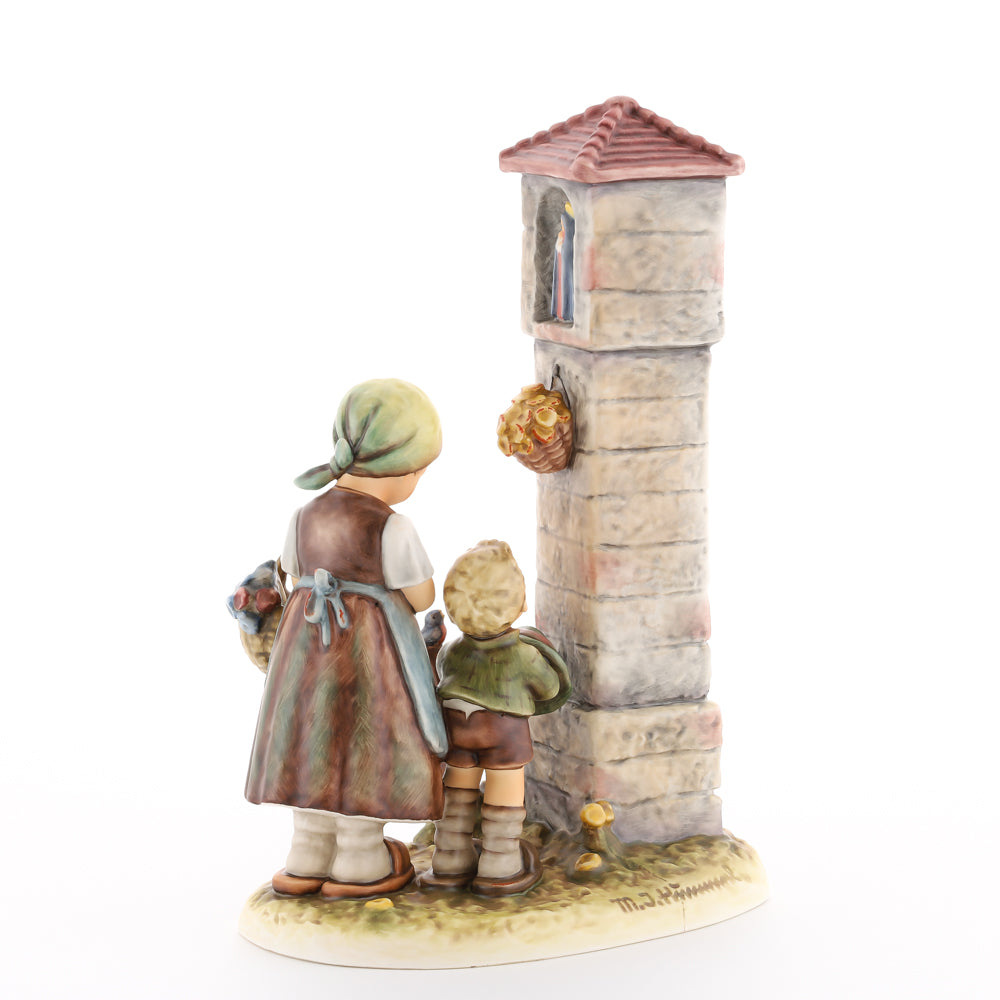 Andächtig halten die beiden Kinder am „Marterl“ inne, dem liebevoll mit Blumen geschmückten Bildstock am Wegesrand. Der kleine Bub hat respektvoll seinen Hut abgenommen und blickt zur Madonnenfigur, die oben in der Säule eingelassen ist. Seine größere Schwester ist ins Gebet versunken. Am Arm trägt sie einen Korb voller Blumen, die vielleicht zu Hause den Tisch schmücken sollen. Ein kleiner Vogel hat sich auf dem Zaun niedergelassen und leistet den Kindern bei ihrer Andacht Gesellschaft. Die neue Figur der Skrobek-Serie hält einen Moment voller inniger Zwiesprache mit Maria auf wunderbare Weise fest und lädt den Betrachter ein, sich immer wieder neu in die fein ausgearbeiteten Details zu vertiefen.