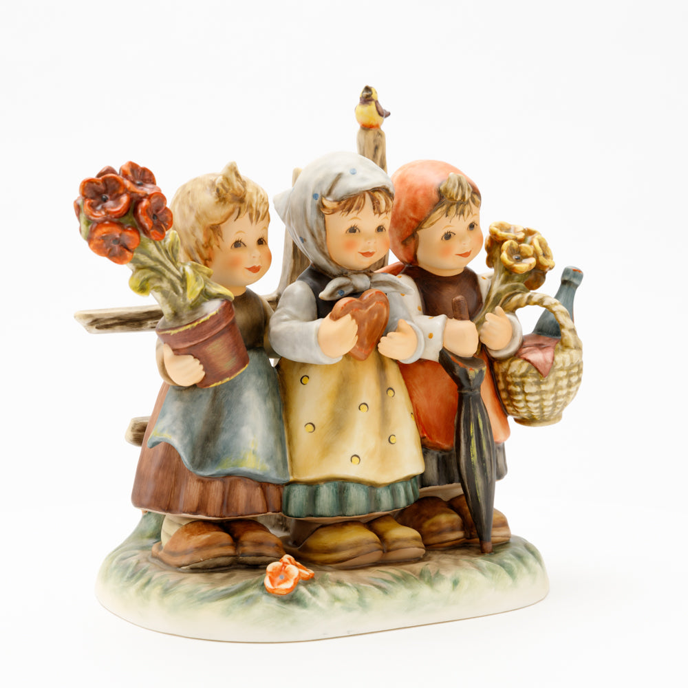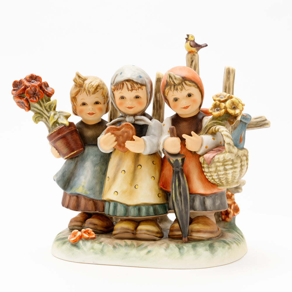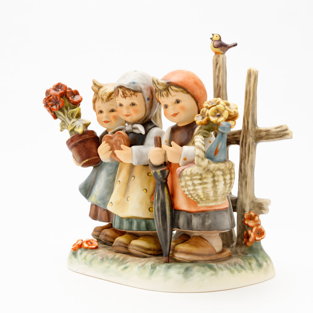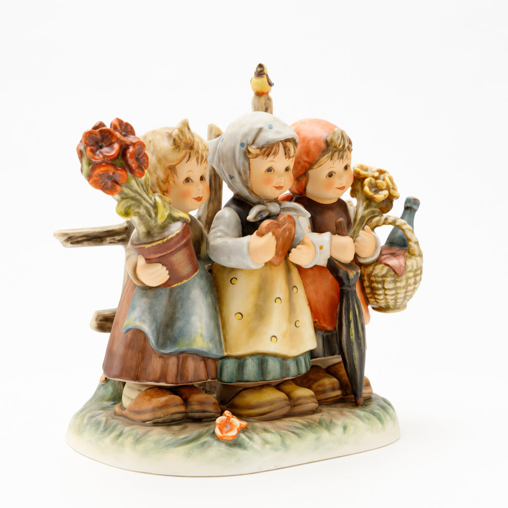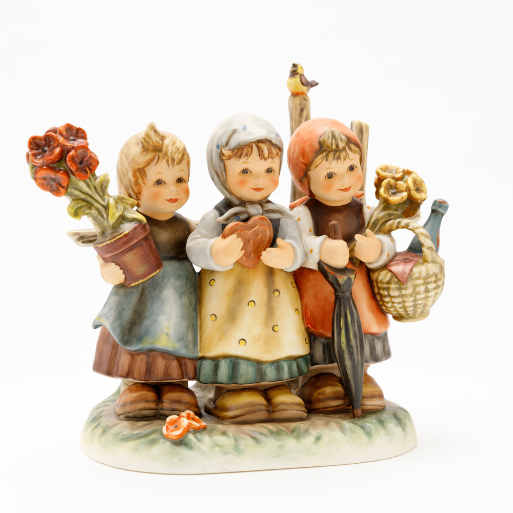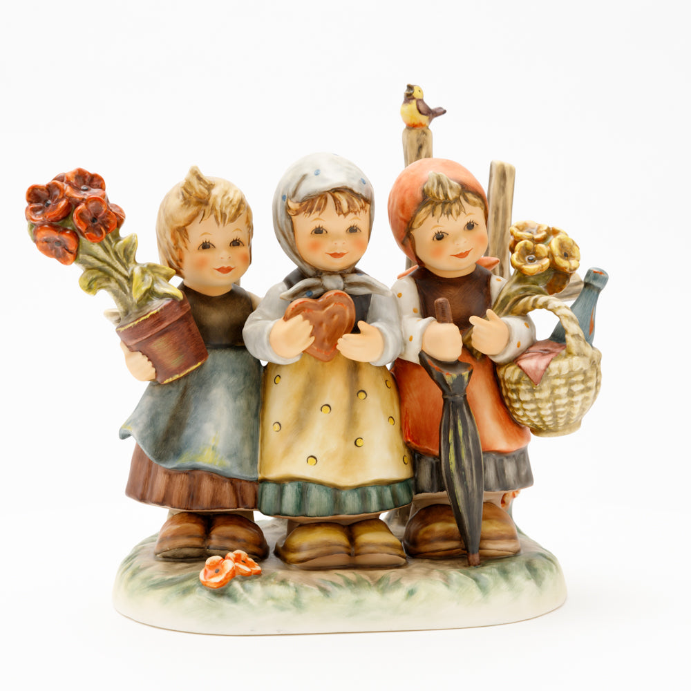 Wer kommt denn da? Drei kleine Mädchen mit strahlendem Lächeln im Gesicht machen ihre Aufwartung. Ist das nicht wunderbar? Im Jahr 1989 kreierte Helmut Fischer diese außergewöhnlich ausdrucksstarke Hummel-Figur. Sie wurde nach einer Originalzeichnung der Schwester Maria Innocentia aus dem Jahr 1941 angefertigt. "Ich bring viel lieb..." war die erste Figur einer Serie, die Childhood Memories (Kindheitserinnerungen) genannt wurde. Sie geriet lange in Vergessenheit und wurde erstmals im Jahr 2017 auf den Markt gebracht. Die Originalzeichnung von Maria Innocentia Hummel trägt folgenden Titel: "I bring viel Lieb und I Viel Freud, und I a Stärk für´d schwere Zeit" (Ich bringe viel Liebe und ich viel Freude, und ich viel Kraft für die schwere Zeit). Die beeindruckende, handgefertigte Figur aus der Hummel Manufaktur Rödental ist auf 1999 Exemplare limitiert.