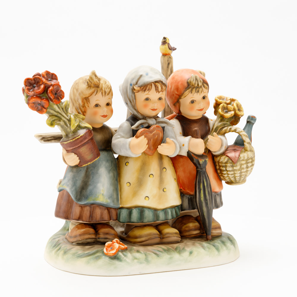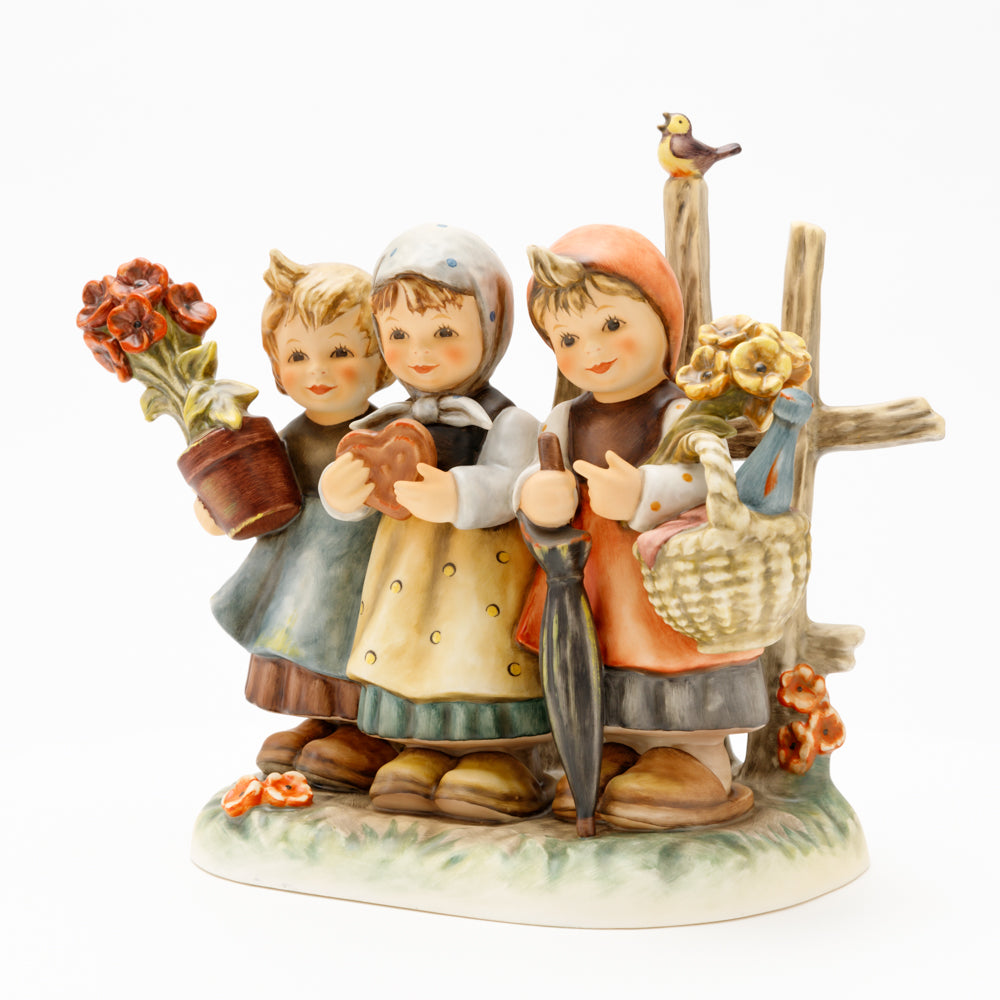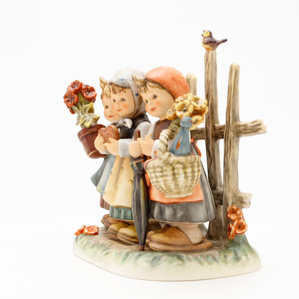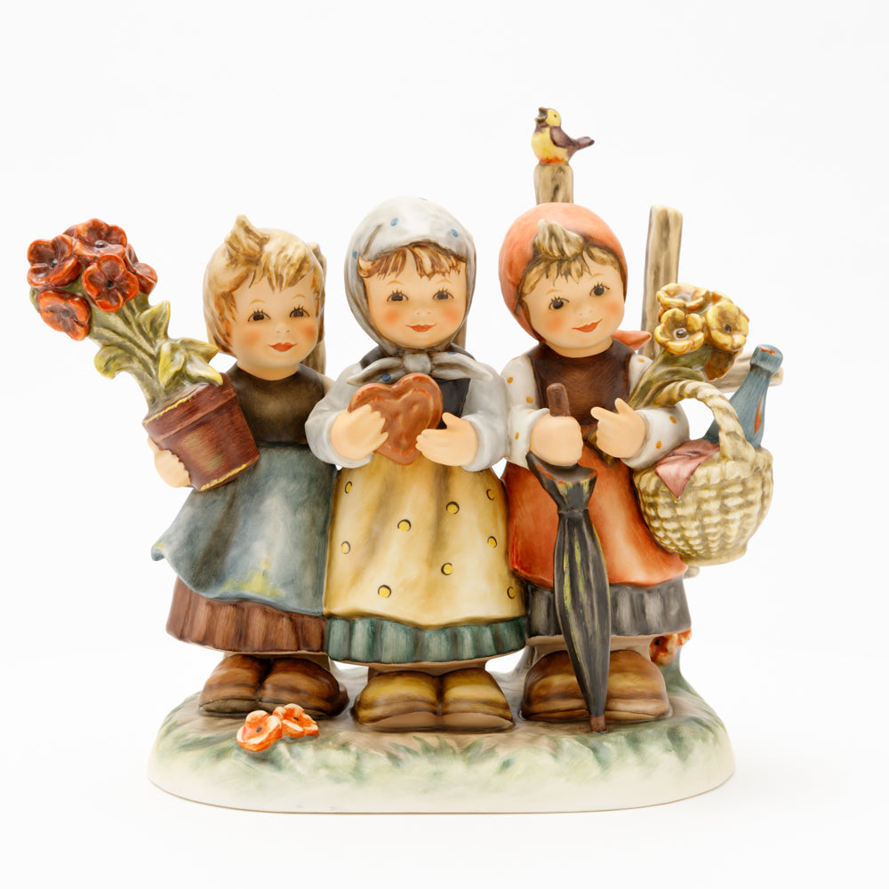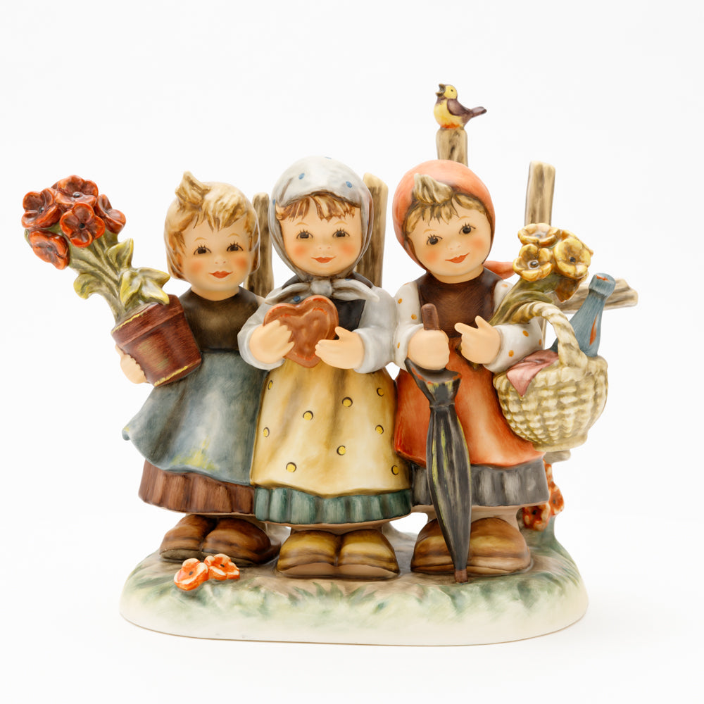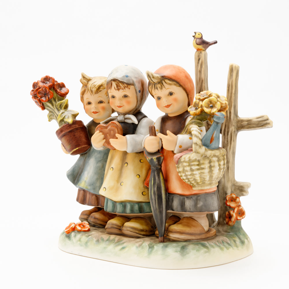 Wer kommt denn da? Drei kleine Mädchen mit strahlendem Lächeln im Gesicht machen ihre Aufwartung. Ist das nicht wunderbar? Im Jahr 1989 kreierte Helmut Fischer diese außergewöhnlich ausdrucksstarke Hummel-Figur. Sie wurde nach einer Originalzeichnung der Schwester Maria Innocentia aus dem Jahr 1941 angefertigt. "Ich bring viel lieb..." war die erste Figur einer Serie, die Childhood Memories (Kindheitserinnerungen) genannt wurde. Sie geriet lange in Vergessenheit und wurde erstmals im Jahr 2017 auf den Markt gebracht. Die Originalzeichnung von Maria Innocentia Hummel trägt folgenden Titel: "I bring viel Lieb und I Viel Freud, und I a Stärk für´d schwere Zeit" (Ich bringe viel Liebe und ich viel Freude, und ich viel Kraft für die schwere Zeit). Die beeindruckende, handgefertigte Figur aus der Hummel Manufaktur Rödental ist auf 1999 Exemplare limitiert.