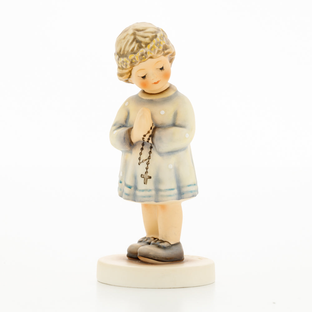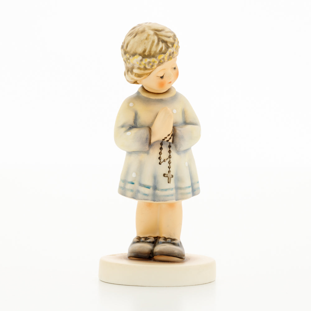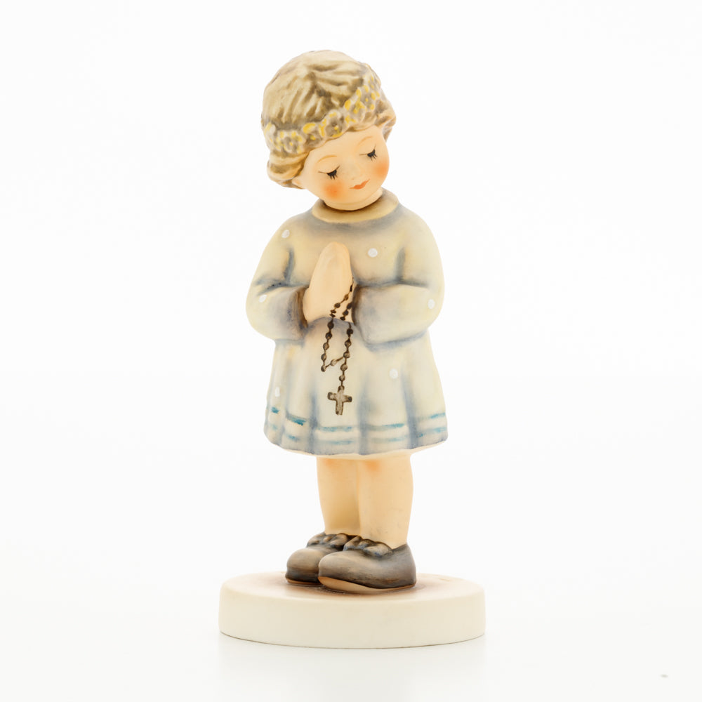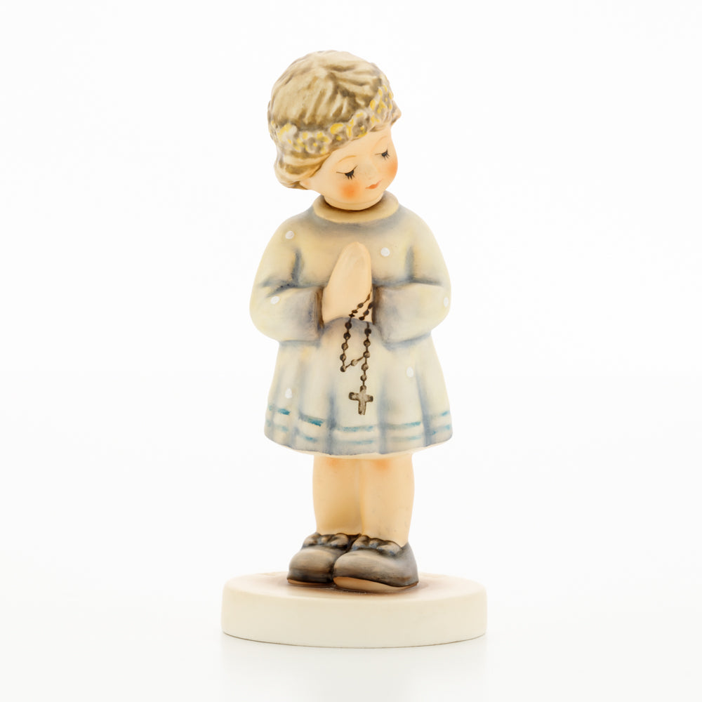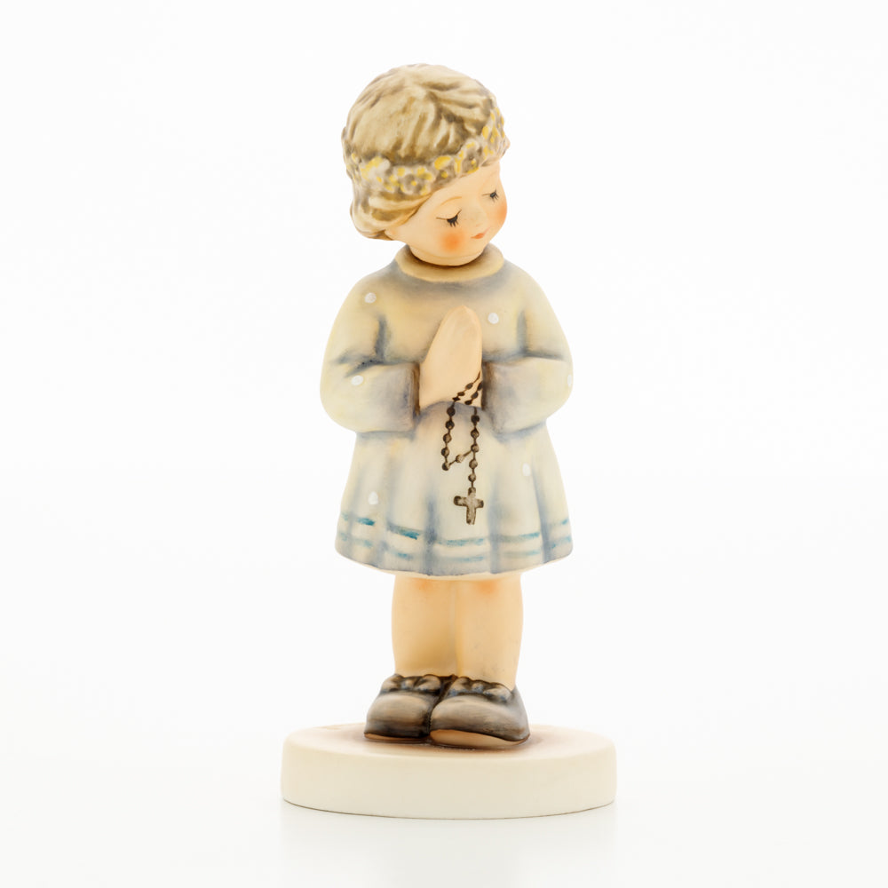 Andächtig und in Gedanken versunken faltet das Hummel-Mädchen die Hände zum Gebet. Um den linken Arm hat die original M.I. Hummel-Figur eine Kette mit Kreuz gebunden. Die Hummel-Figur lässt sich auch mit einem individuellen Schriftzug versehen. Ob als Erinnerung an die eigene Kommunion bzw. Konfirmation oder als Geschenk für ein Kommunionkind oder einen Konfirmanden/eine Konfirmandin: Mit dieser Hummel-Figur hat man stets ein wertvolles Andenken.