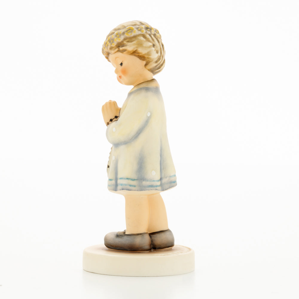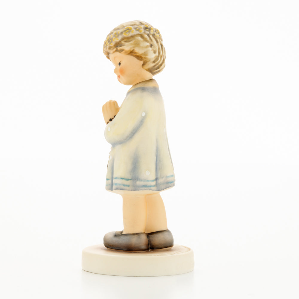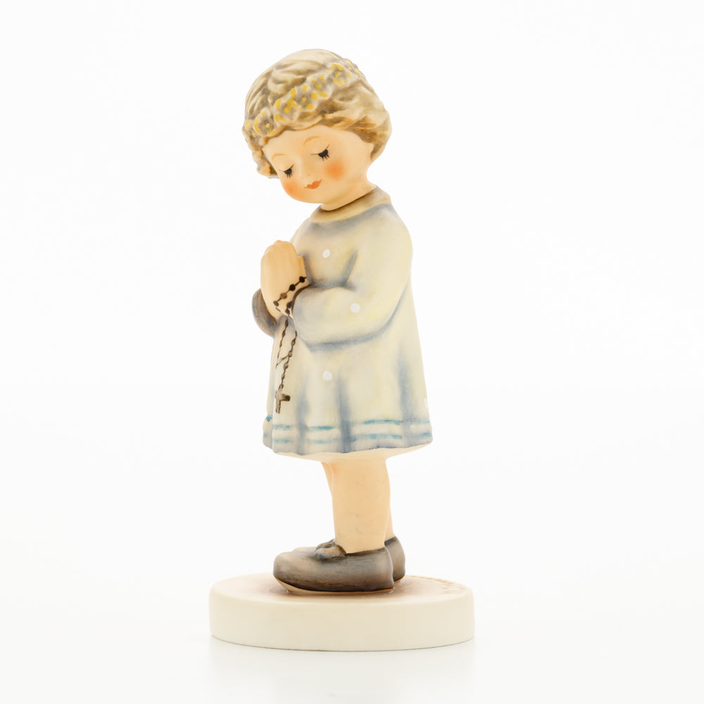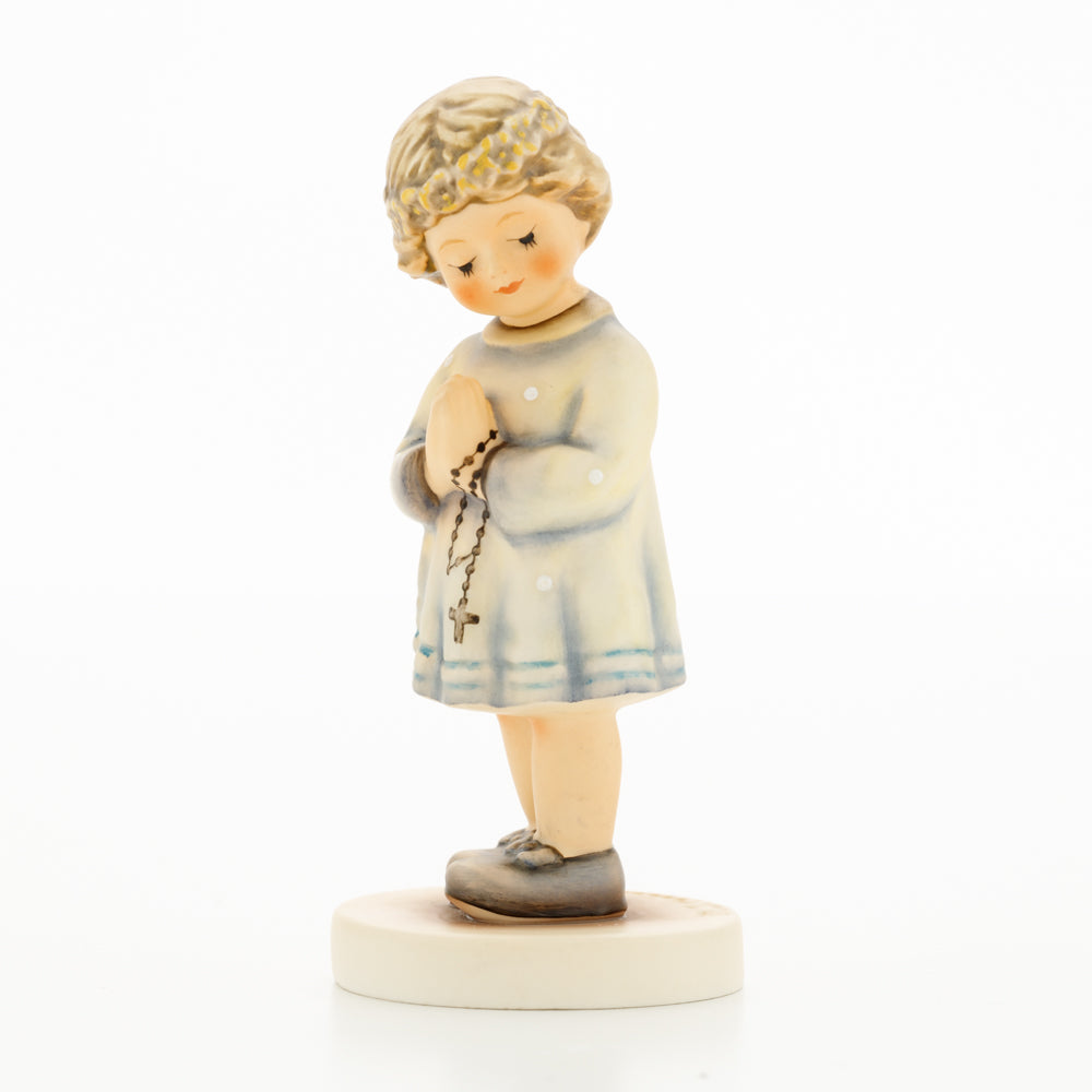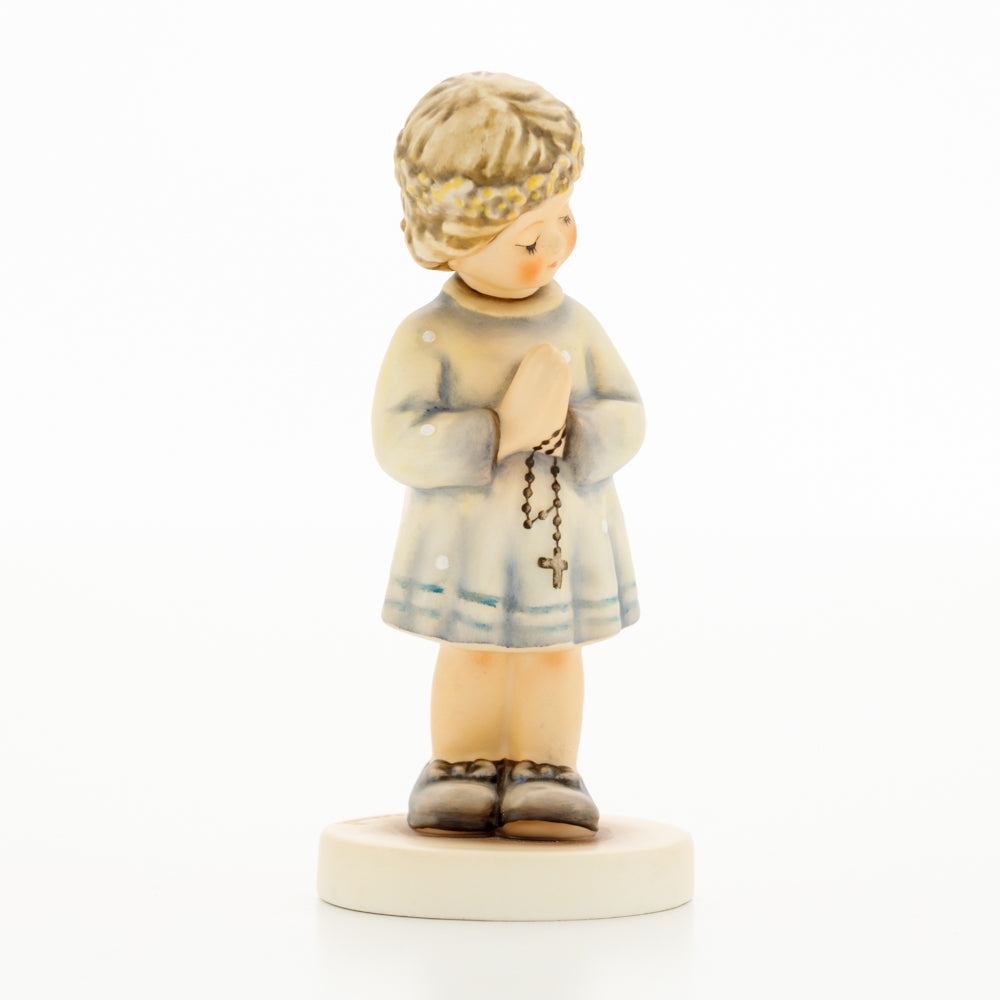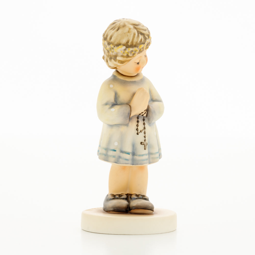 Andächtig und in Gedanken versunken faltet das Hummel-Mädchen die Hände zum Gebet. Um den linken Arm hat die original M.I. Hummel-Figur eine Kette mit Kreuz gebunden. Die Hummel-Figur lässt sich auch mit einem individuellen Schriftzug versehen. Ob als Erinnerung an die eigene Kommunion bzw. Konfirmation oder als Geschenk für ein Kommunionkind oder einen Konfirmanden/eine Konfirmandin: Mit dieser Hummel-Figur hat man stets ein wertvolles Andenken.