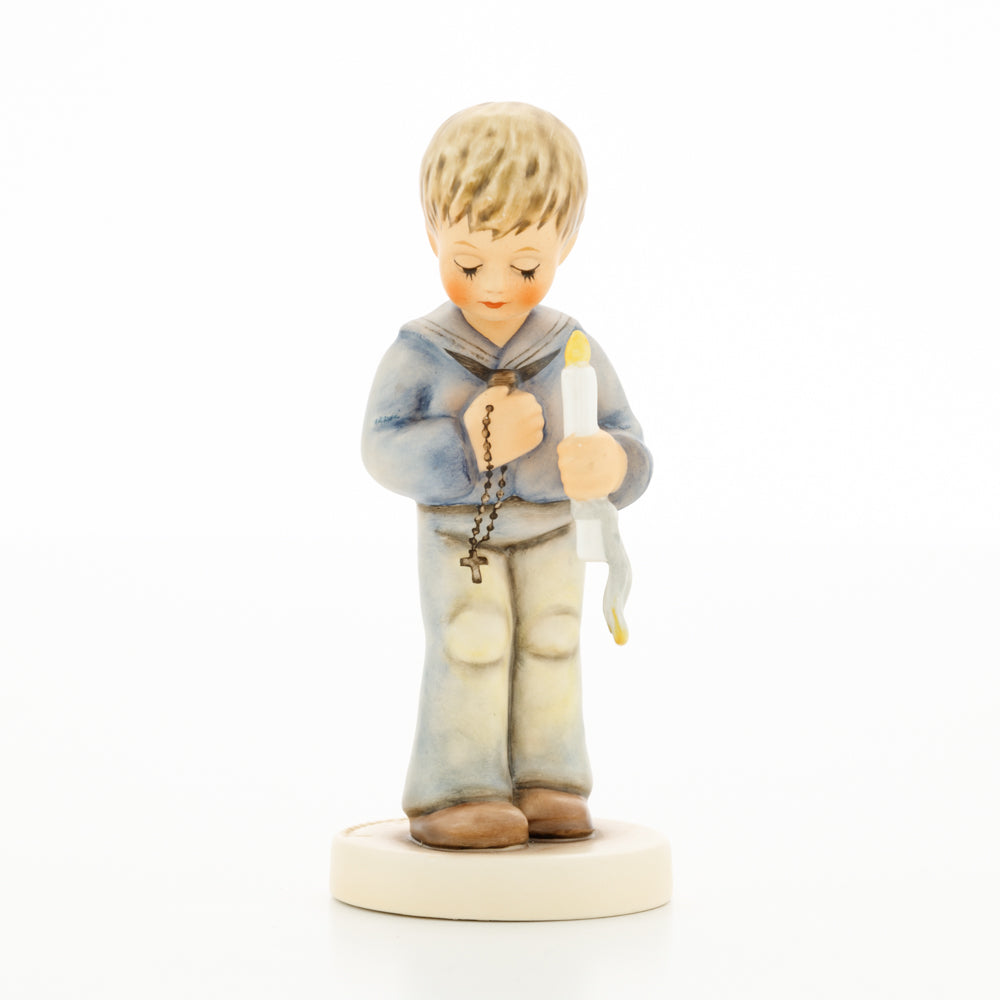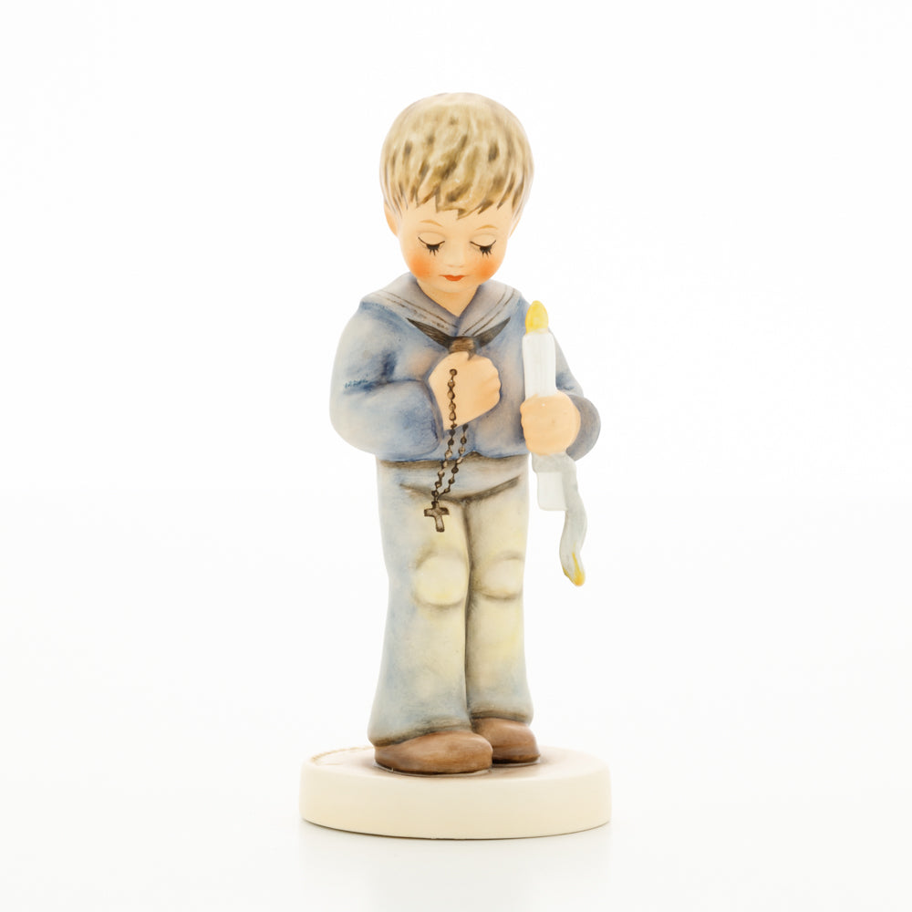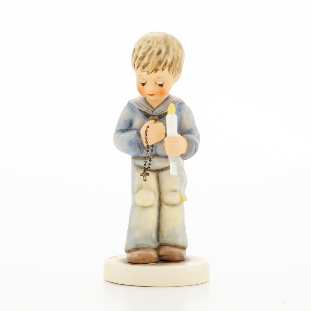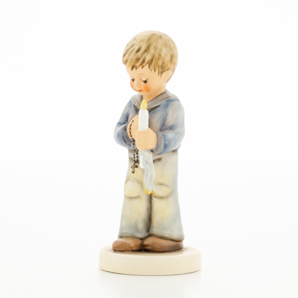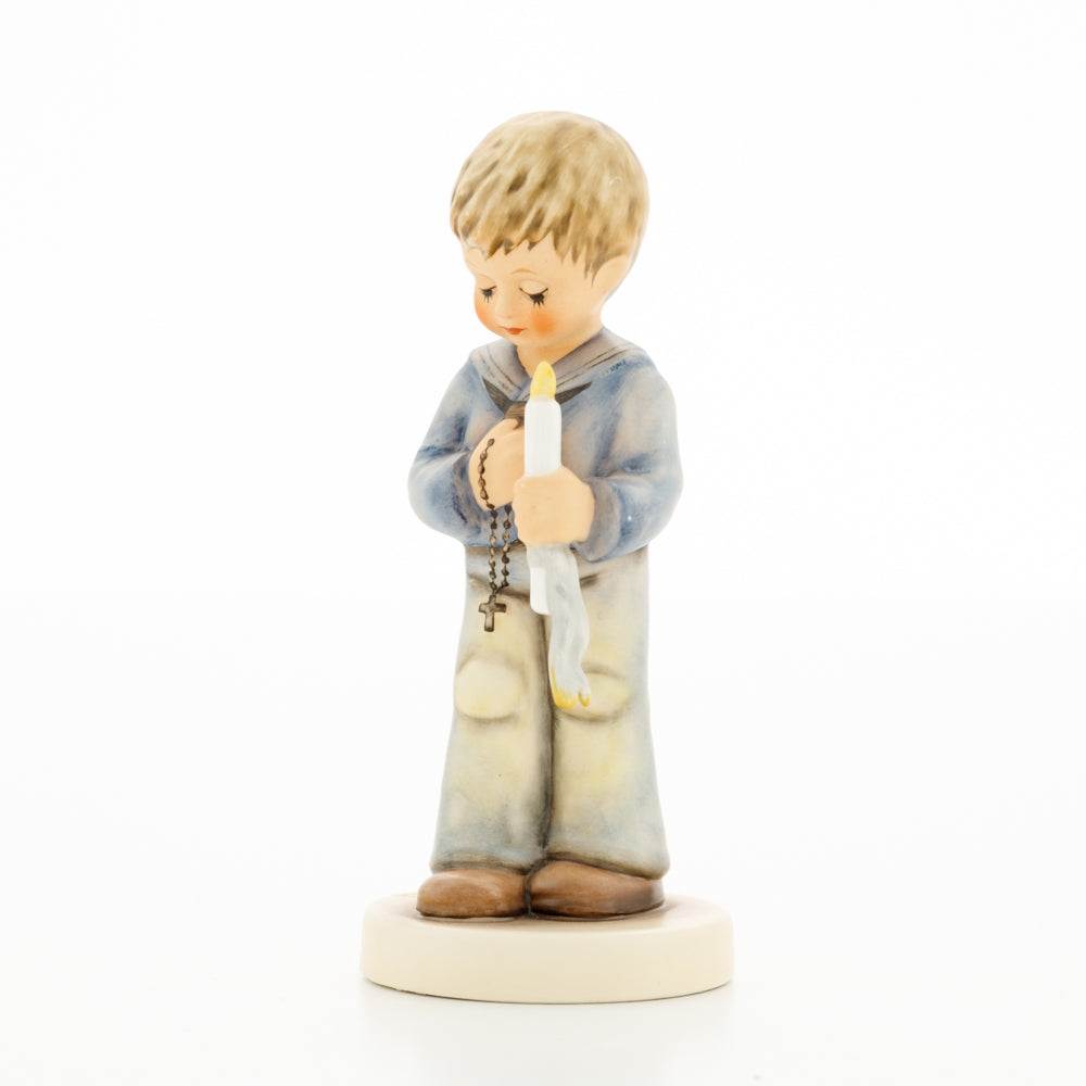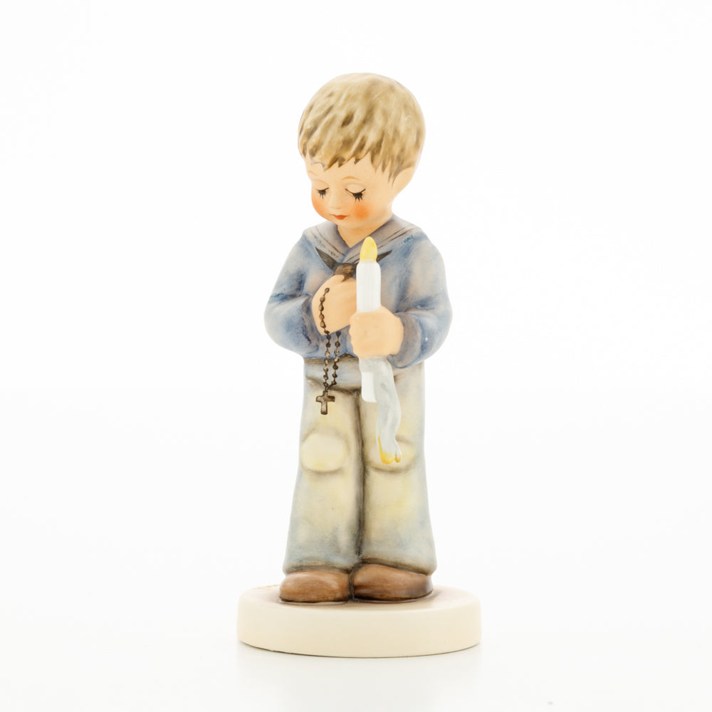 Die original M.I. Hummel-Figur "Kommunion Junge" stellt das Pendant zu der Hummel-Figur "Kommunion Mädchen" (HUM 814) dar. Auch der Junge hat eine mit einem Kreuzanhänger versehene Kette in der Hand. Im Gegensatz zu dem Hummel-Mädchen faltet der Hummel-Bub aber nicht die Hände, sondern hält in der linken Hand die für eine Kommunion bzw. Konfirmation typische Kerze. Wie das Mädchen eignet sich auch der Bub aus der Hummel Manufaktur Rödental als Geschenk zu Konfirmation oder Kommunion. Auch diese Hummel-Figur lässt sich für zzgl. zehn Euro individuell beschriften.