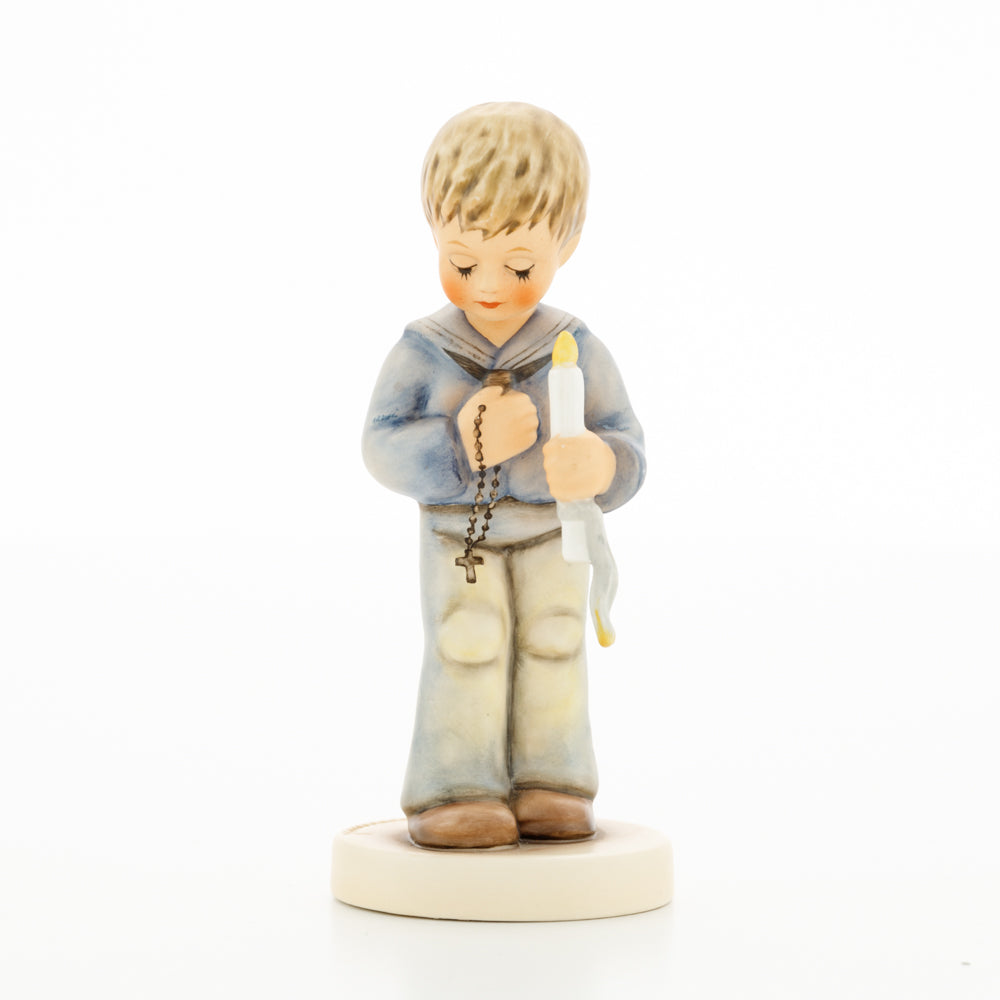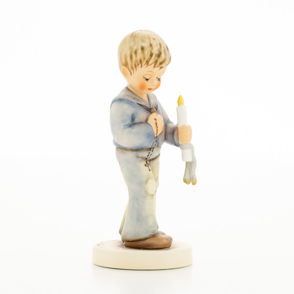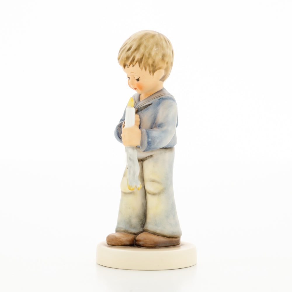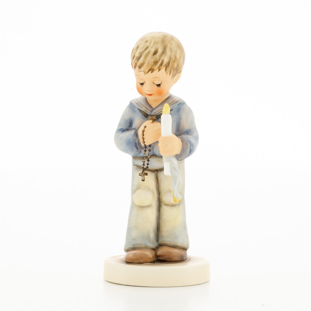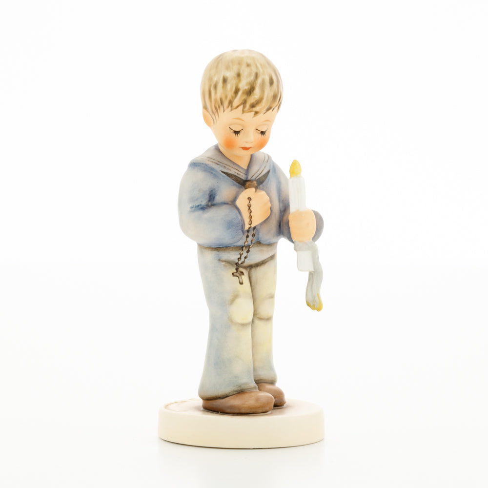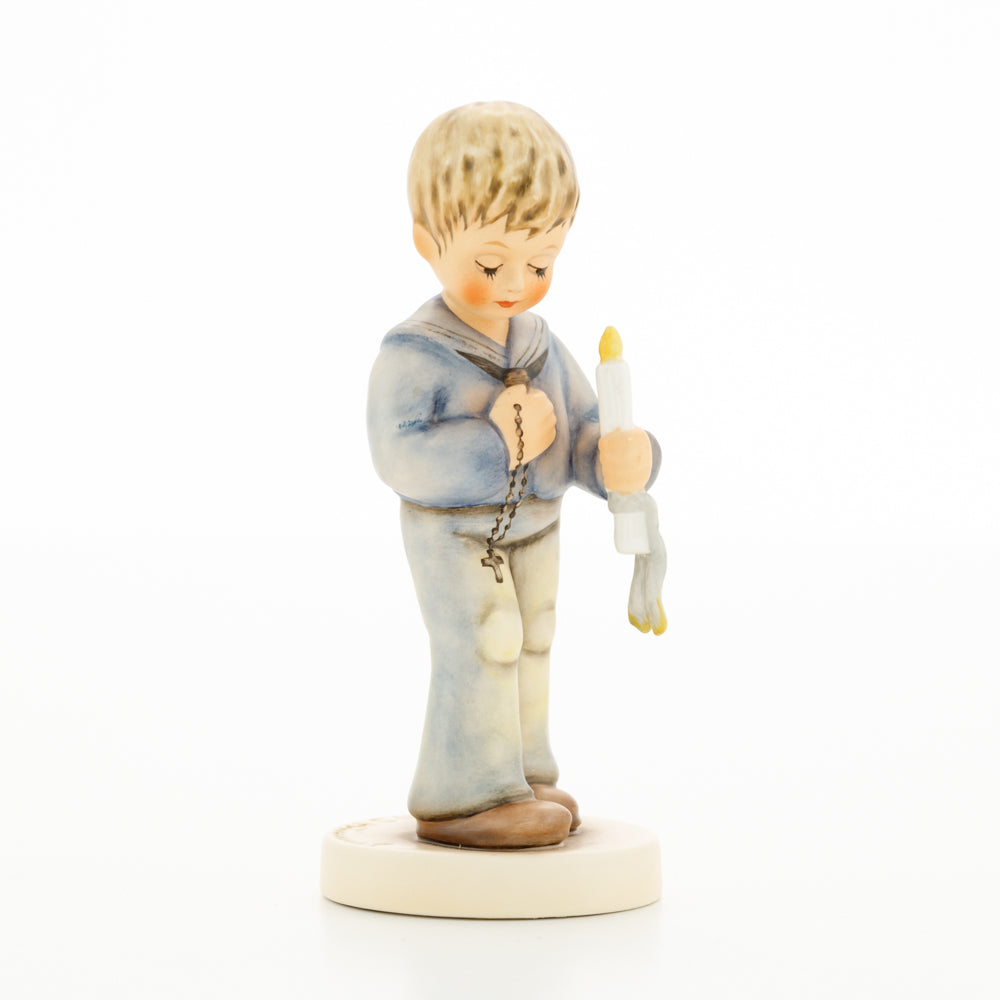 Die original M.I. Hummel-Figur "Kommunion Junge" stellt das Pendant zu der Hummel-Figur "Kommunion Mädchen" (HUM 814) dar. Auch der Junge hat eine mit einem Kreuzanhänger versehene Kette in der Hand. Im Gegensatz zu dem Hummel-Mädchen faltet der Hummel-Bub aber nicht die Hände, sondern hält in der linken Hand die für eine Kommunion bzw. Konfirmation typische Kerze. Wie das Mädchen eignet sich auch der Bub aus der Hummel Manufaktur Rödental als Geschenk zu Konfirmation oder Kommunion. Auch diese Hummel-Figur lässt sich für zzgl. zehn Euro individuell beschriften.