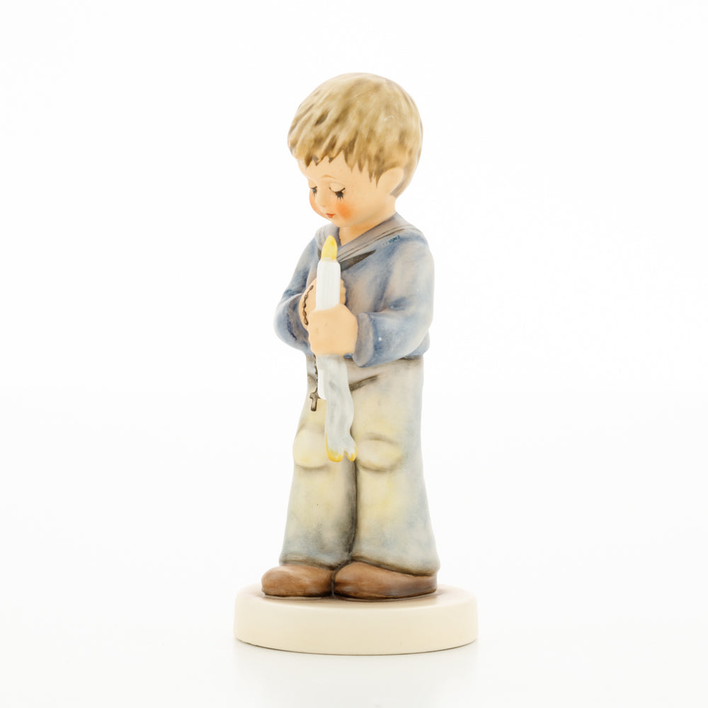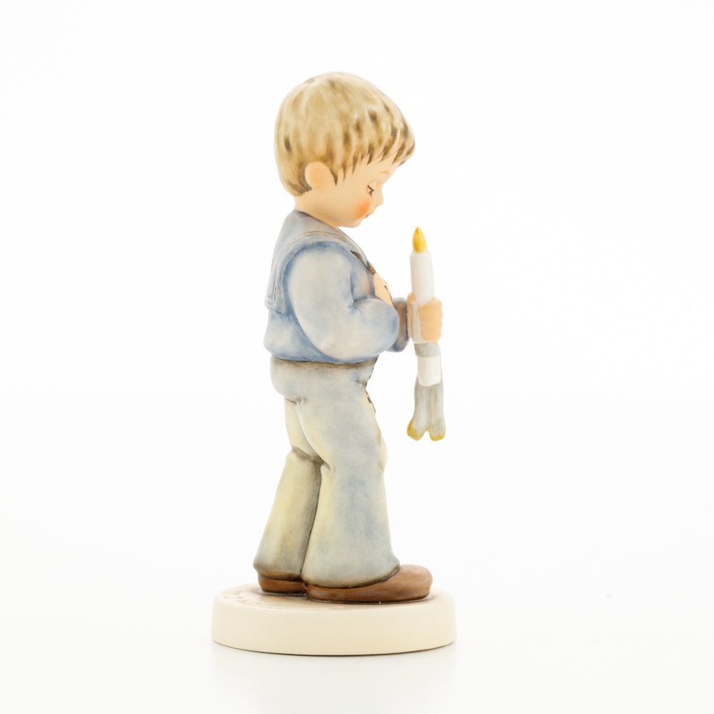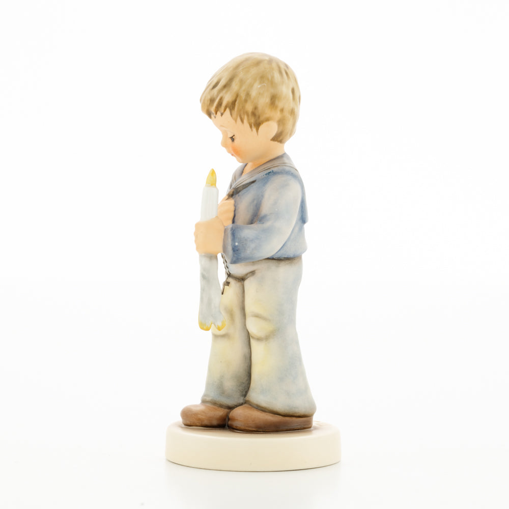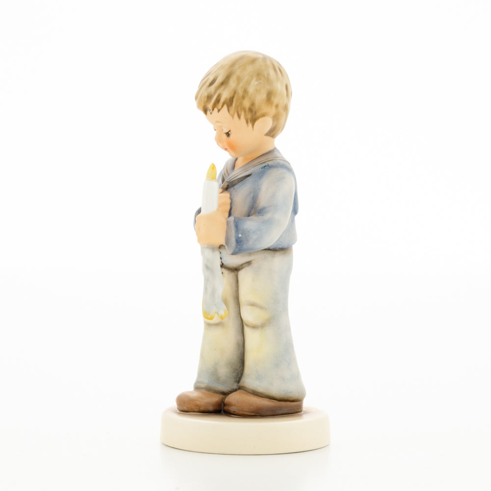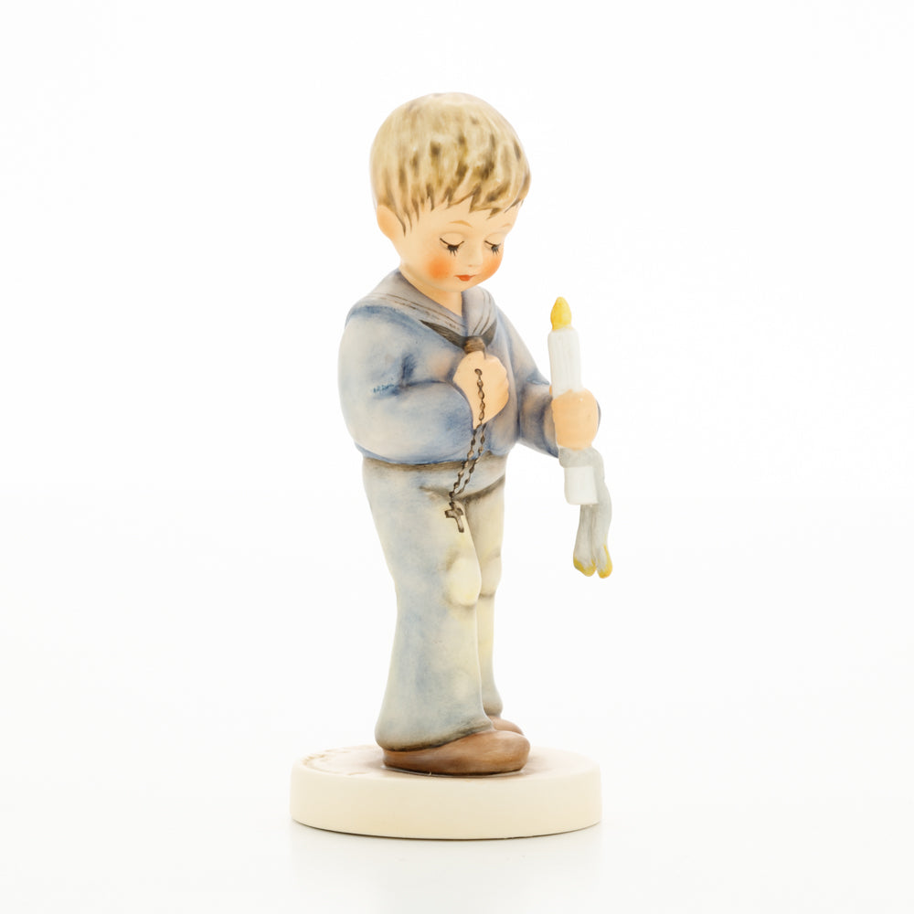 Die original M.I. Hummel-Figur "Kommunion Junge" stellt das Pendant zu der Hummel-Figur "Kommunion Mädchen" (HUM 814) dar. Auch der Junge hat eine mit einem Kreuzanhänger versehene Kette in der Hand. Im Gegensatz zu dem Hummel-Mädchen faltet der Hummel-Bub aber nicht die Hände, sondern hält in der linken Hand die für eine Kommunion bzw. Konfirmation typische Kerze. Wie das Mädchen eignet sich auch der Bub aus der Hummel Manufaktur Rödental als Geschenk zu Konfirmation oder Kommunion. Auch diese Hummel-Figur lässt sich für zzgl. zehn Euro individuell beschriften.