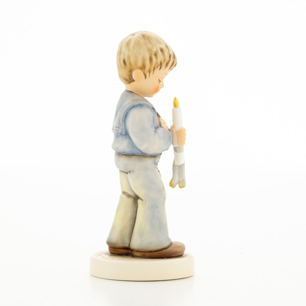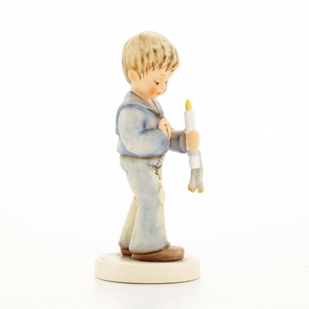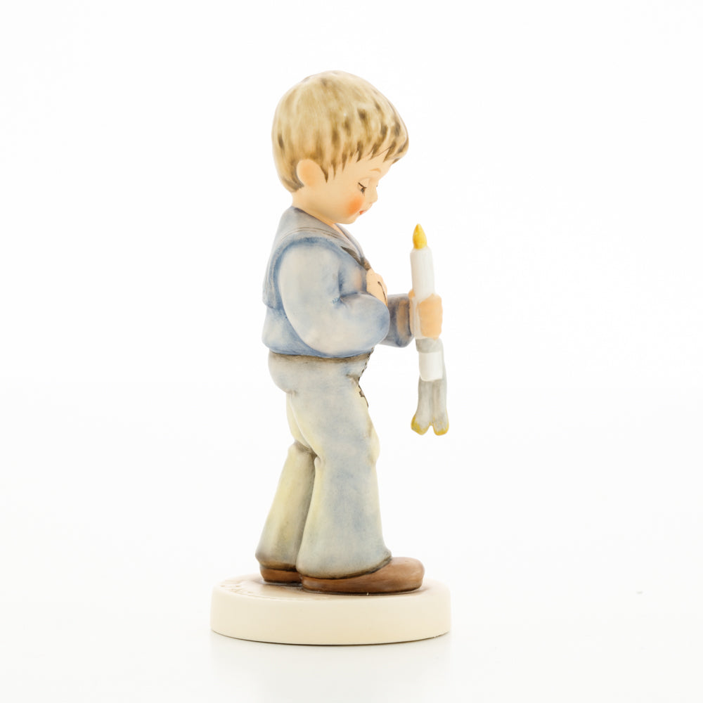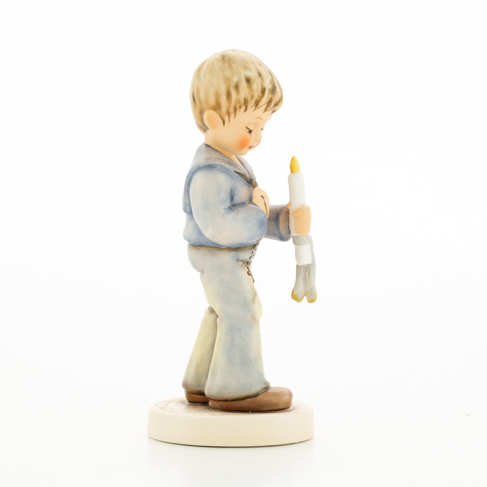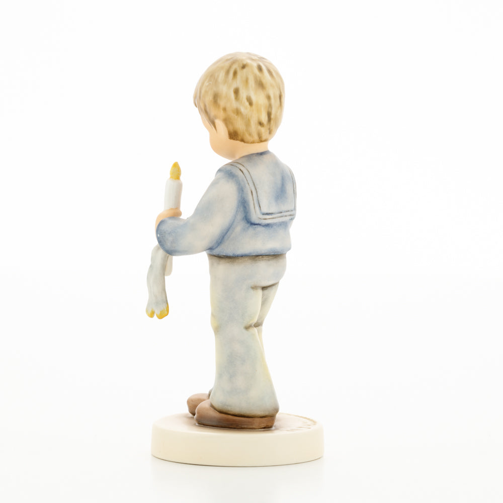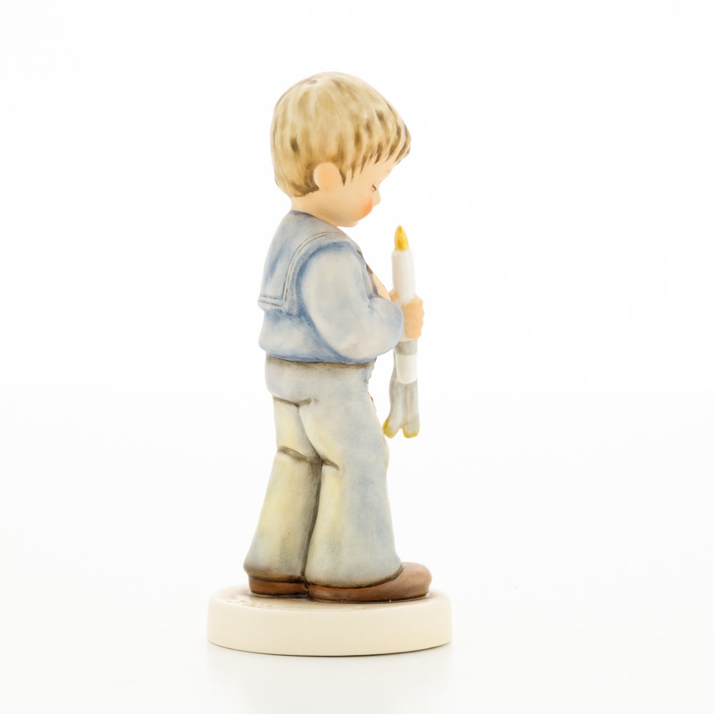 Die original M.I. Hummel-Figur "Kommunion Junge" stellt das Pendant zu der Hummel-Figur "Kommunion Mädchen" (HUM 814) dar. Auch der Junge hat eine mit einem Kreuzanhänger versehene Kette in der Hand. Im Gegensatz zu dem Hummel-Mädchen faltet der Hummel-Bub aber nicht die Hände, sondern hält in der linken Hand die für eine Kommunion bzw. Konfirmation typische Kerze. Wie das Mädchen eignet sich auch der Bub aus der Hummel Manufaktur Rödental als Geschenk zu Konfirmation oder Kommunion. Auch diese Hummel-Figur lässt sich für zzgl. zehn Euro individuell beschriften.