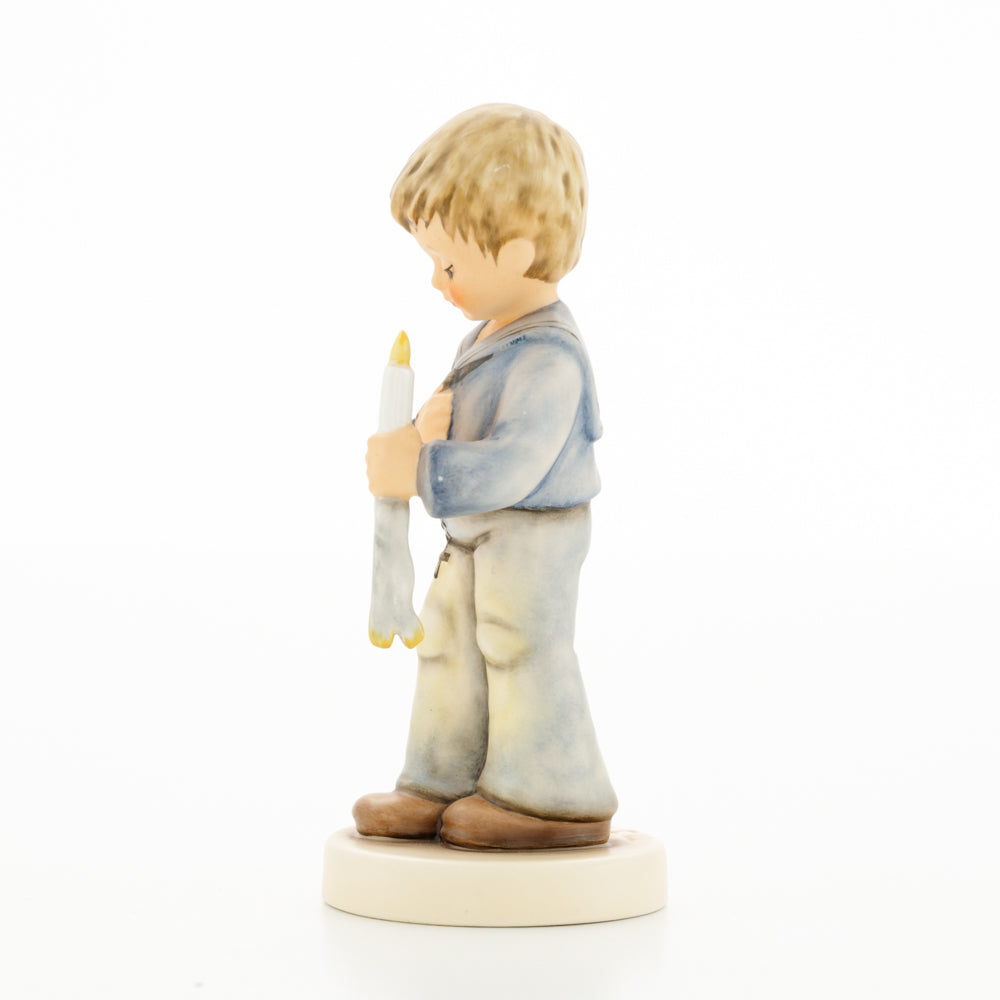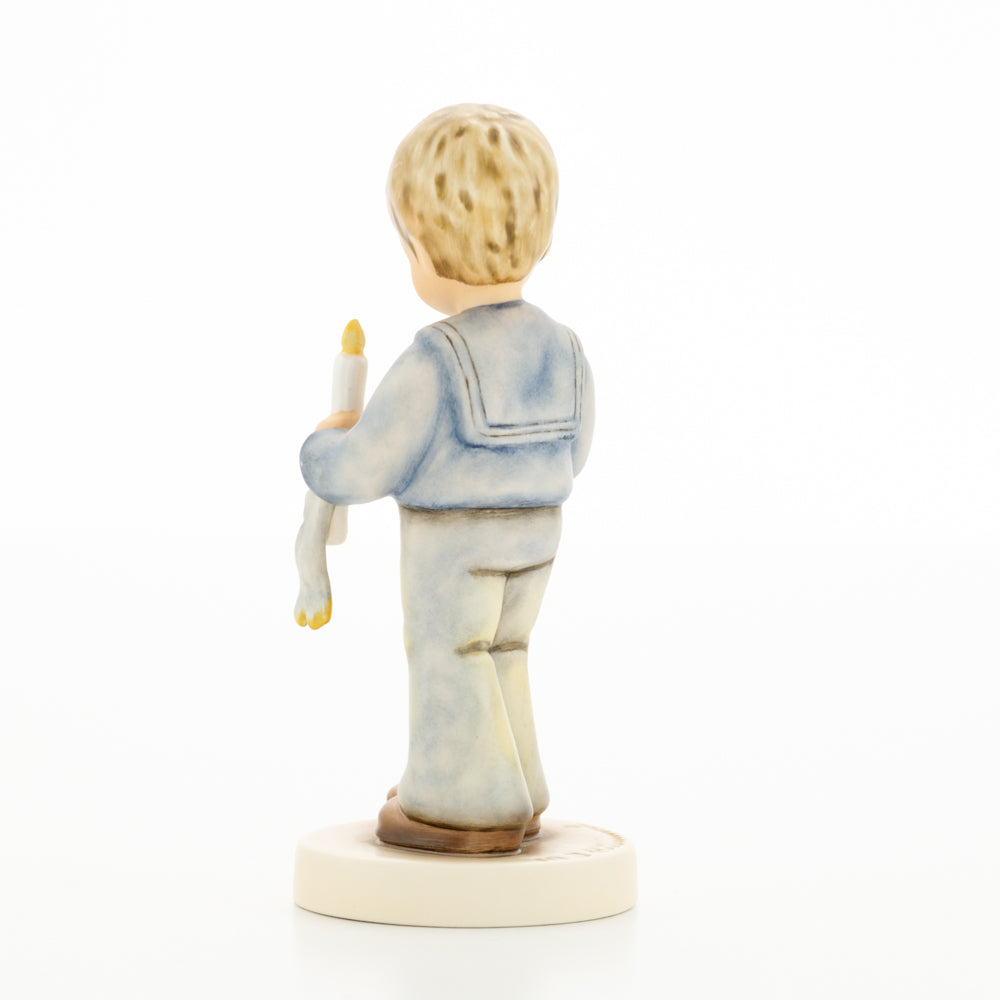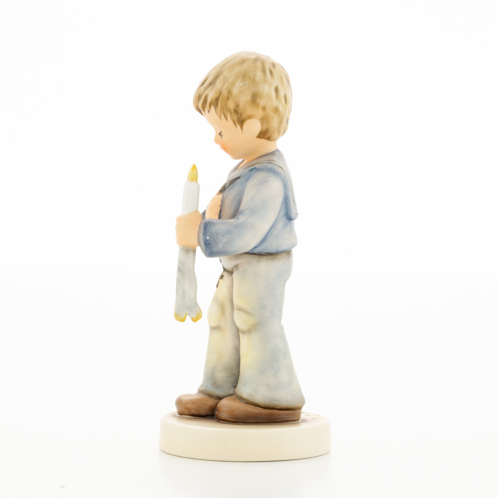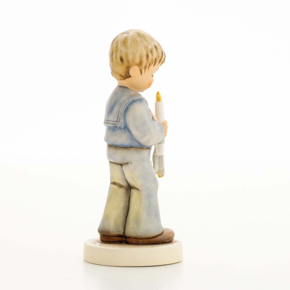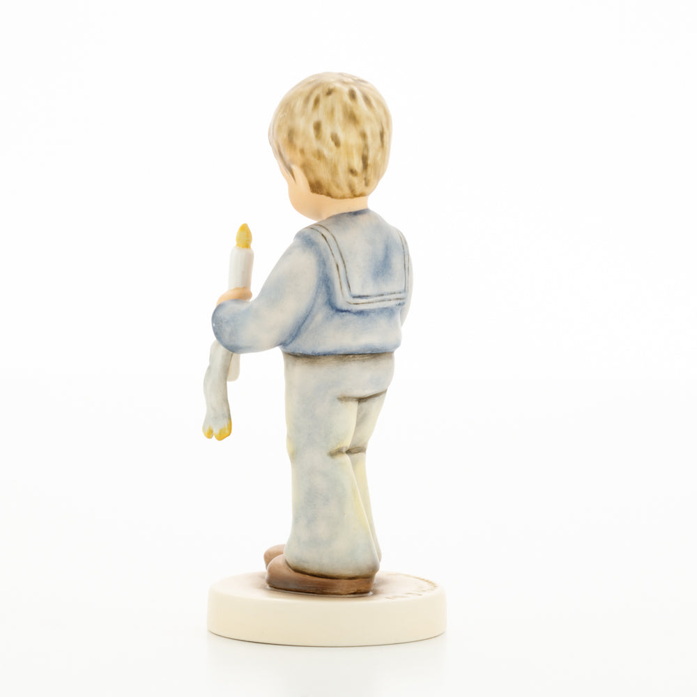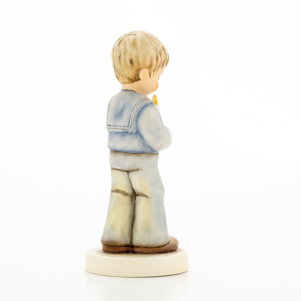 Die original M.I. Hummel-Figur "Kommunion Junge" stellt das Pendant zu der Hummel-Figur "Kommunion Mädchen" (HUM 814) dar. Auch der Junge hat eine mit einem Kreuzanhänger versehene Kette in der Hand. Im Gegensatz zu dem Hummel-Mädchen faltet der Hummel-Bub aber nicht die Hände, sondern hält in der linken Hand die für eine Kommunion bzw. Konfirmation typische Kerze. Wie das Mädchen eignet sich auch der Bub aus der Hummel Manufaktur Rödental als Geschenk zu Konfirmation oder Kommunion. Auch diese Hummel-Figur lässt sich für zzgl. zehn Euro individuell beschriften.